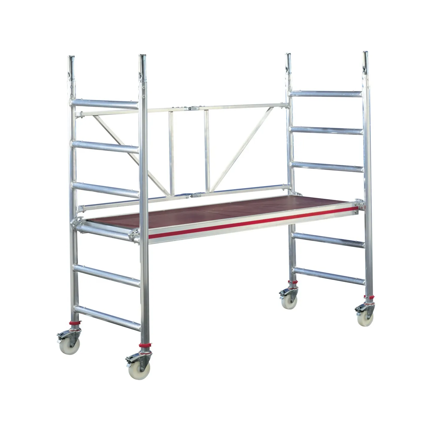 Échafaudage roulant pliant aluminium 0,80 x 1,90 m à système modulaire extensible à 6,10 m de hauteur de travail maximale.