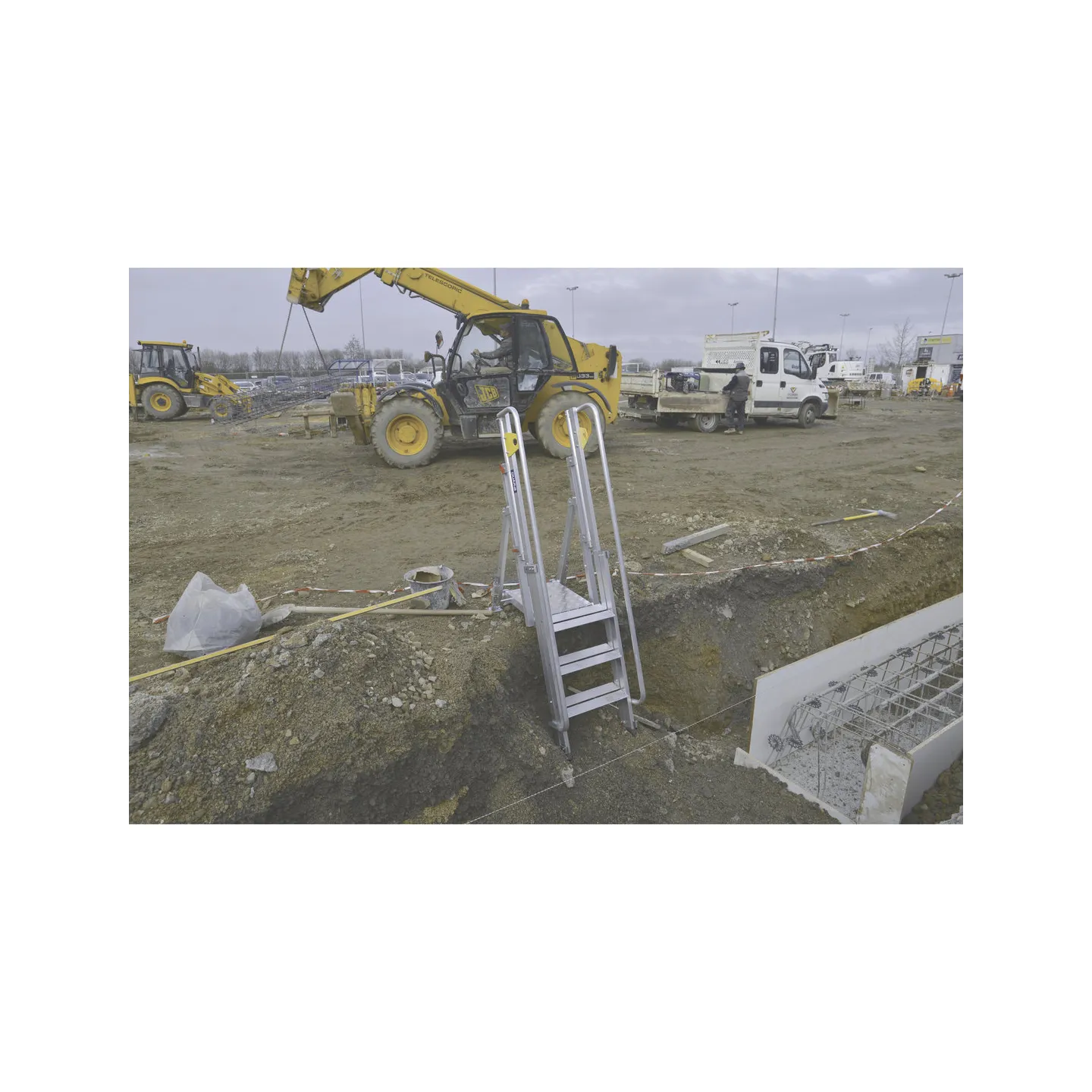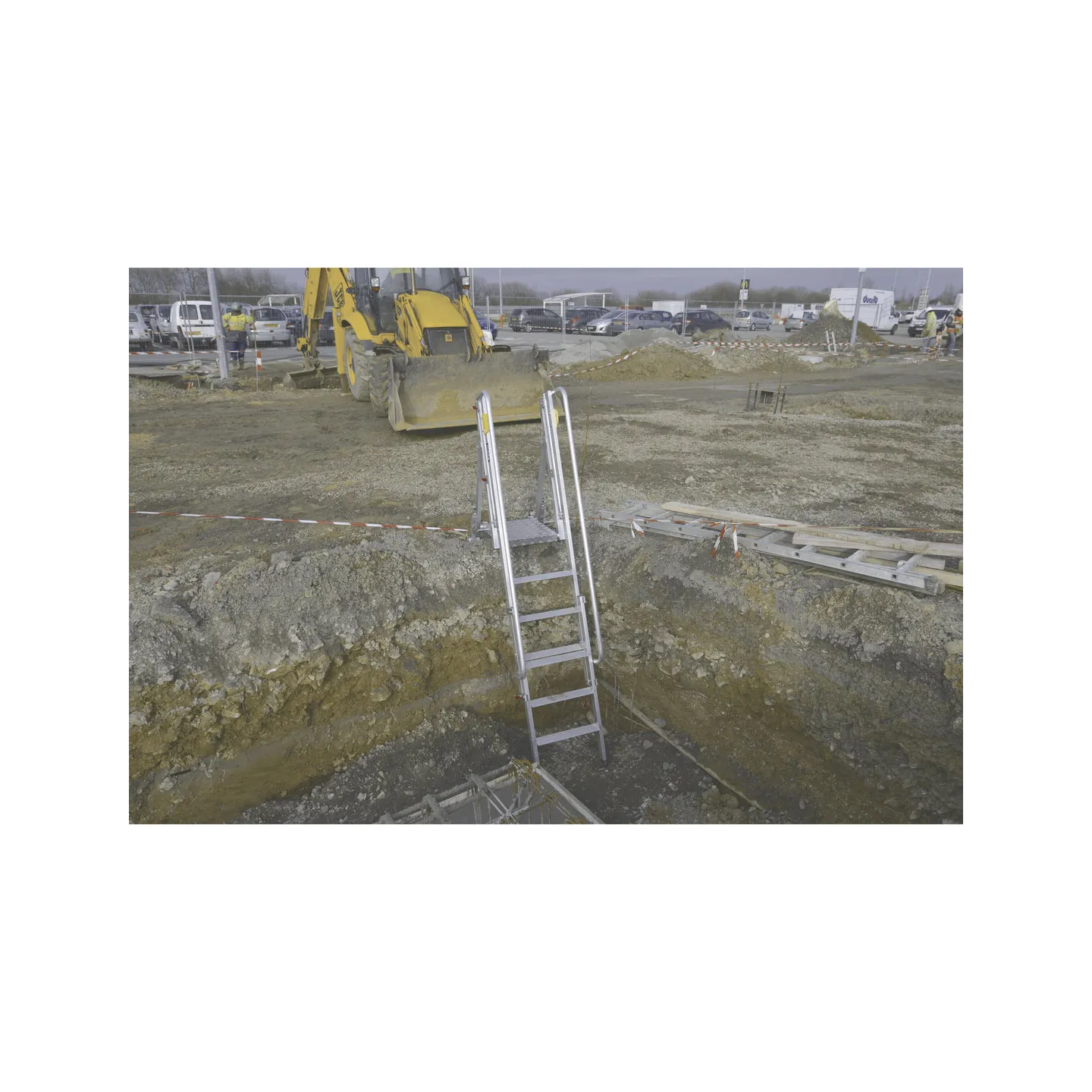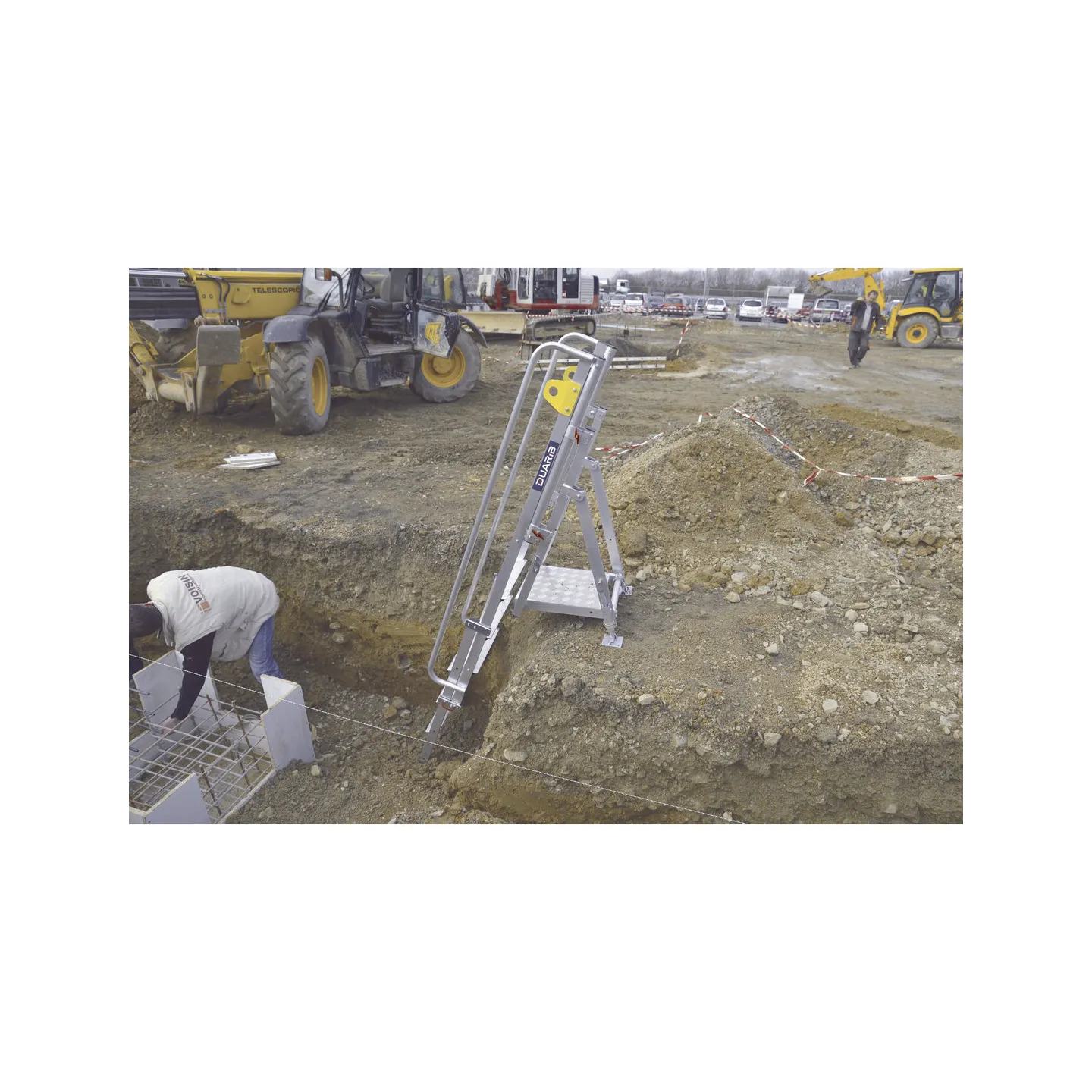 Accès fond de fouille sécurisé sans blindage, avec dispositif anti-basculement intégré. Stable sur sols accidentés, réglable en hauteur et pliable pour un transport et une mise en œuvre facilités.