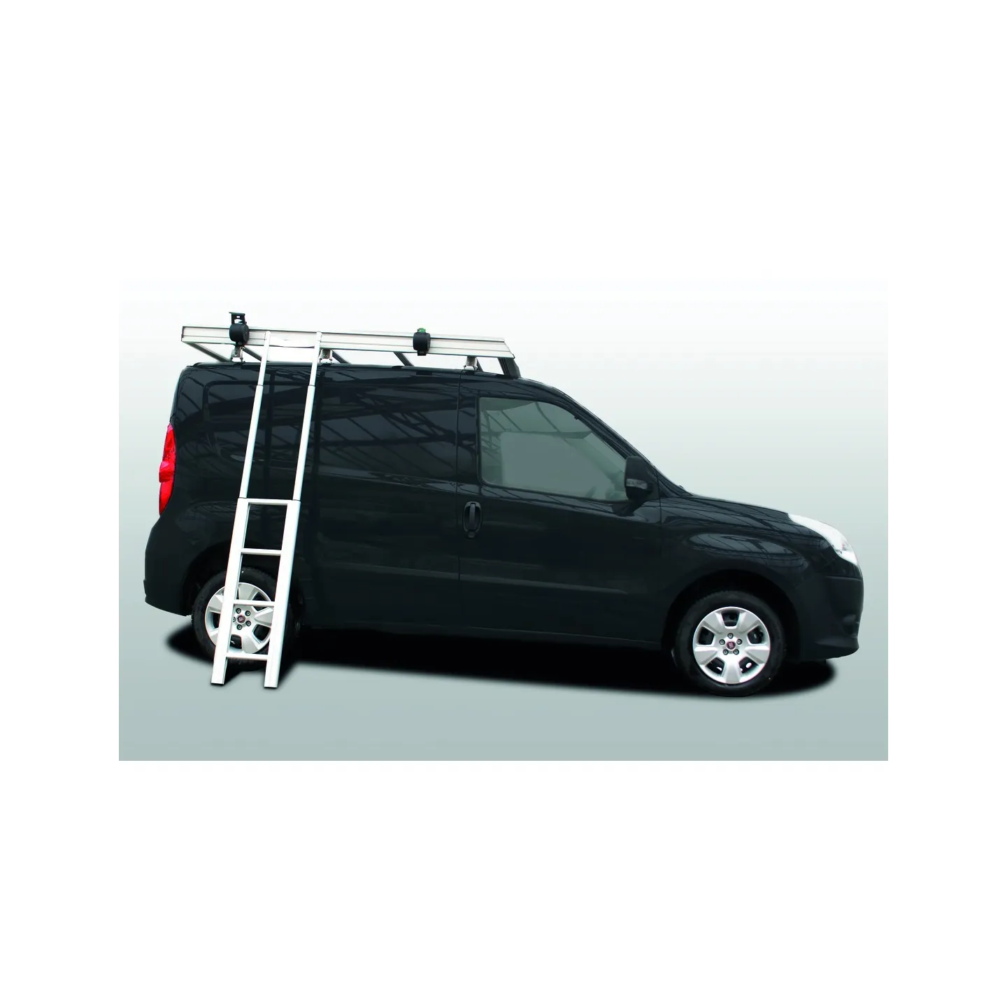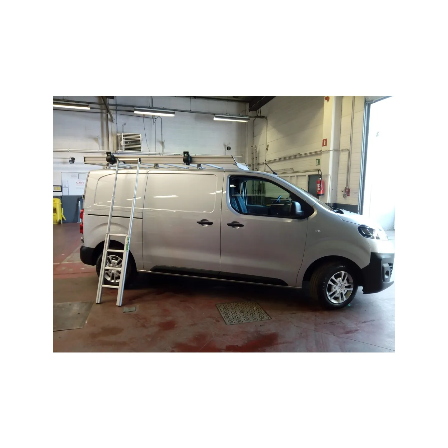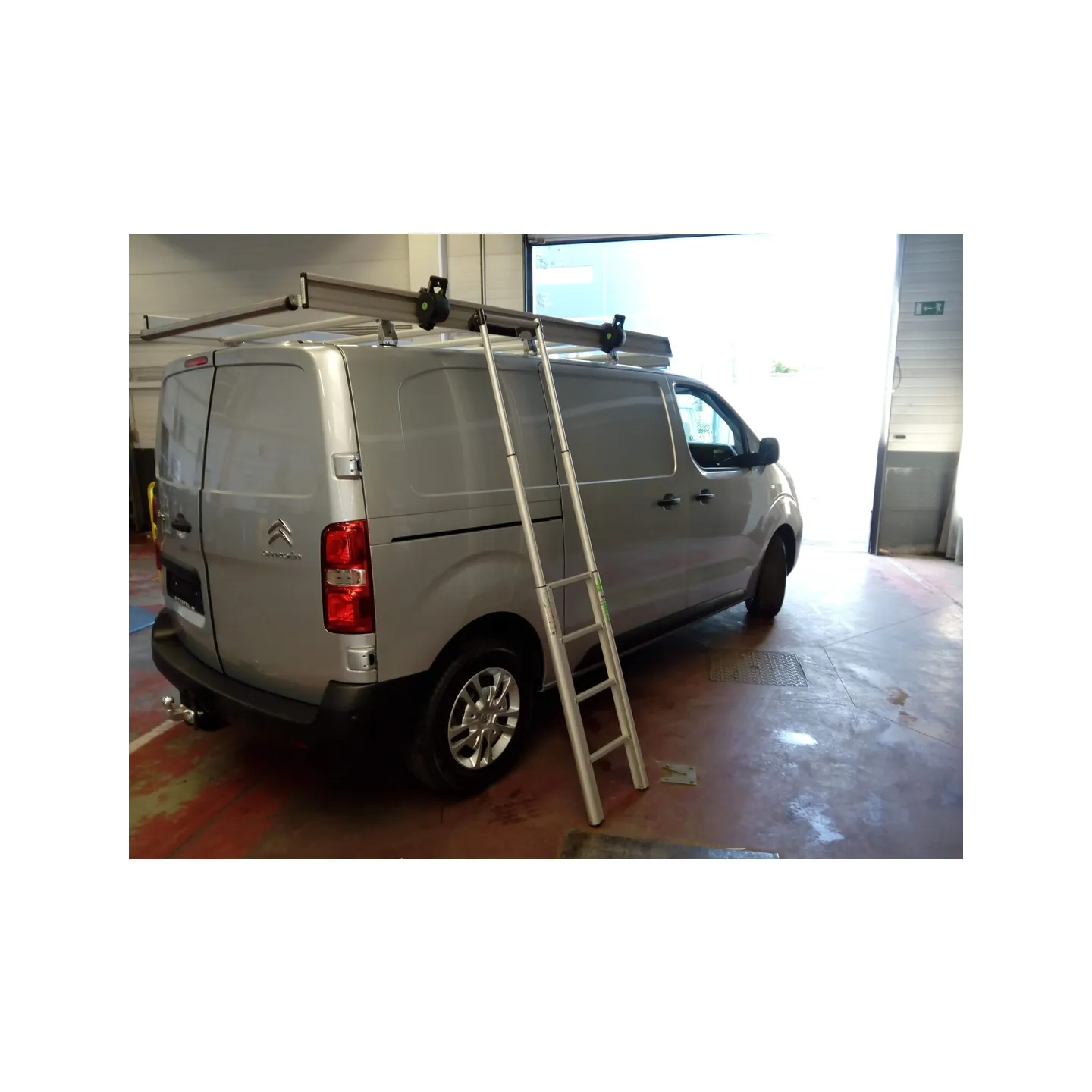 L'échelle télescopique : elle a été concue pour accéder latéralement au toit de la camionnette, ce qui évite à l’utilisateur de devoir monter sur le véhicule pour y fixer un objet à transporter. Son extrémité supérieure se pose sur le montant de la galerie, de façon à pouvoir se positionner et manipuler aisément le boitier à sangle pour arrimer la charge.