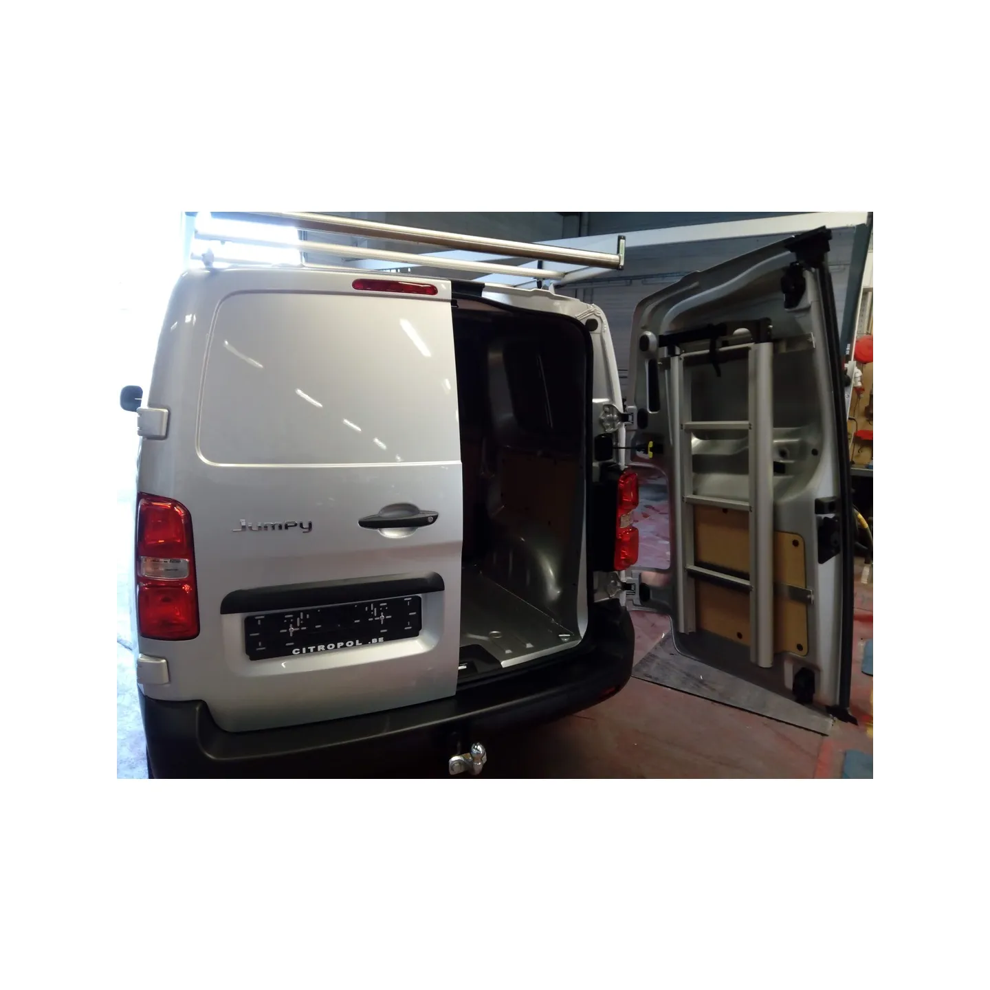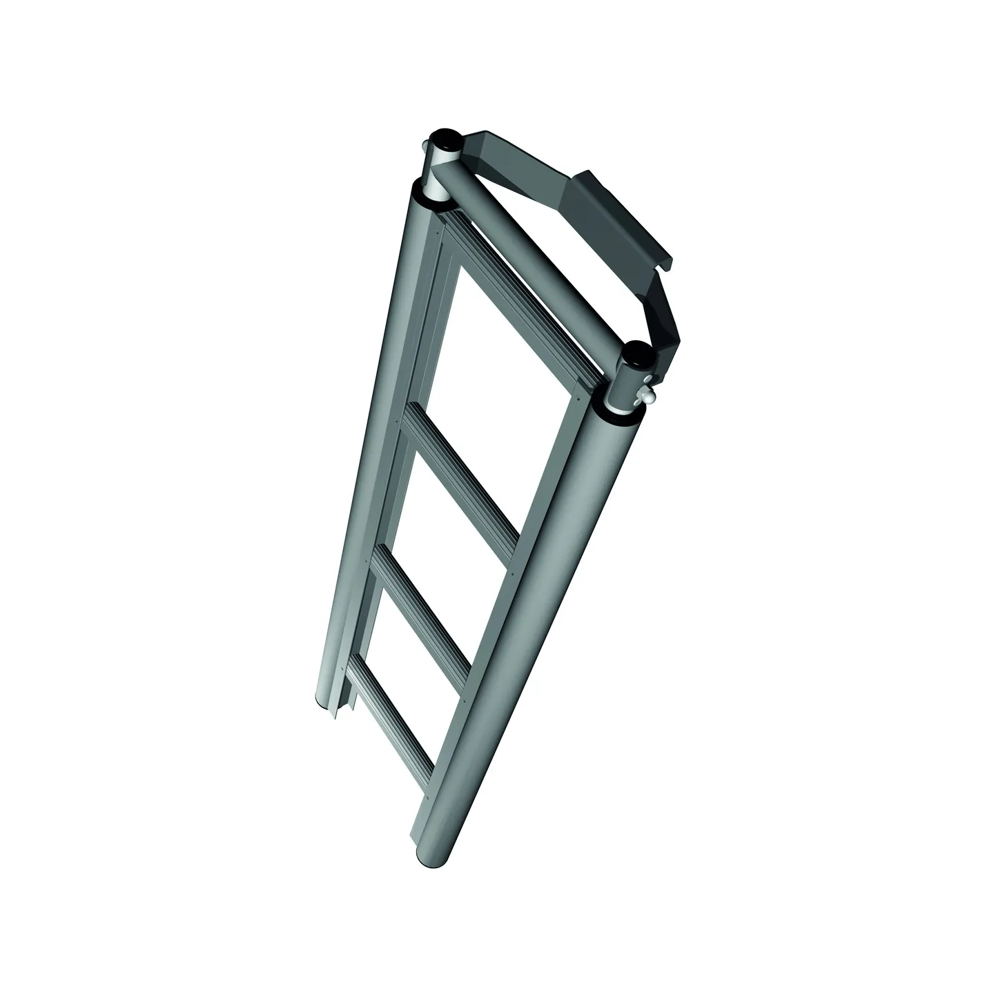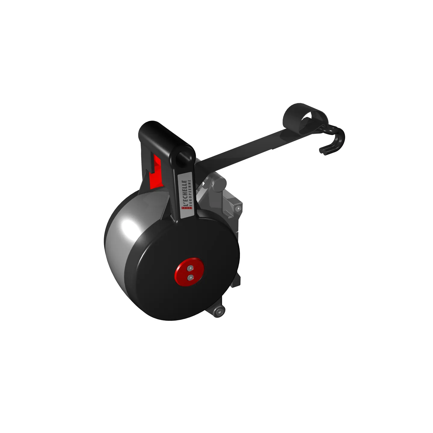 L'échelle télescopique : elle a été concue pour accéder latéralement au toit de la camionnette, ce qui évite à l’utilisateur de devoir monter sur le véhicule pour y fixer un objet à transporter. Son extrémité supérieure se pose sur le montant de la galerie, de façon à pouvoir se positionner et manipuler aisément le boitier à sangle pour arrimer la charge.