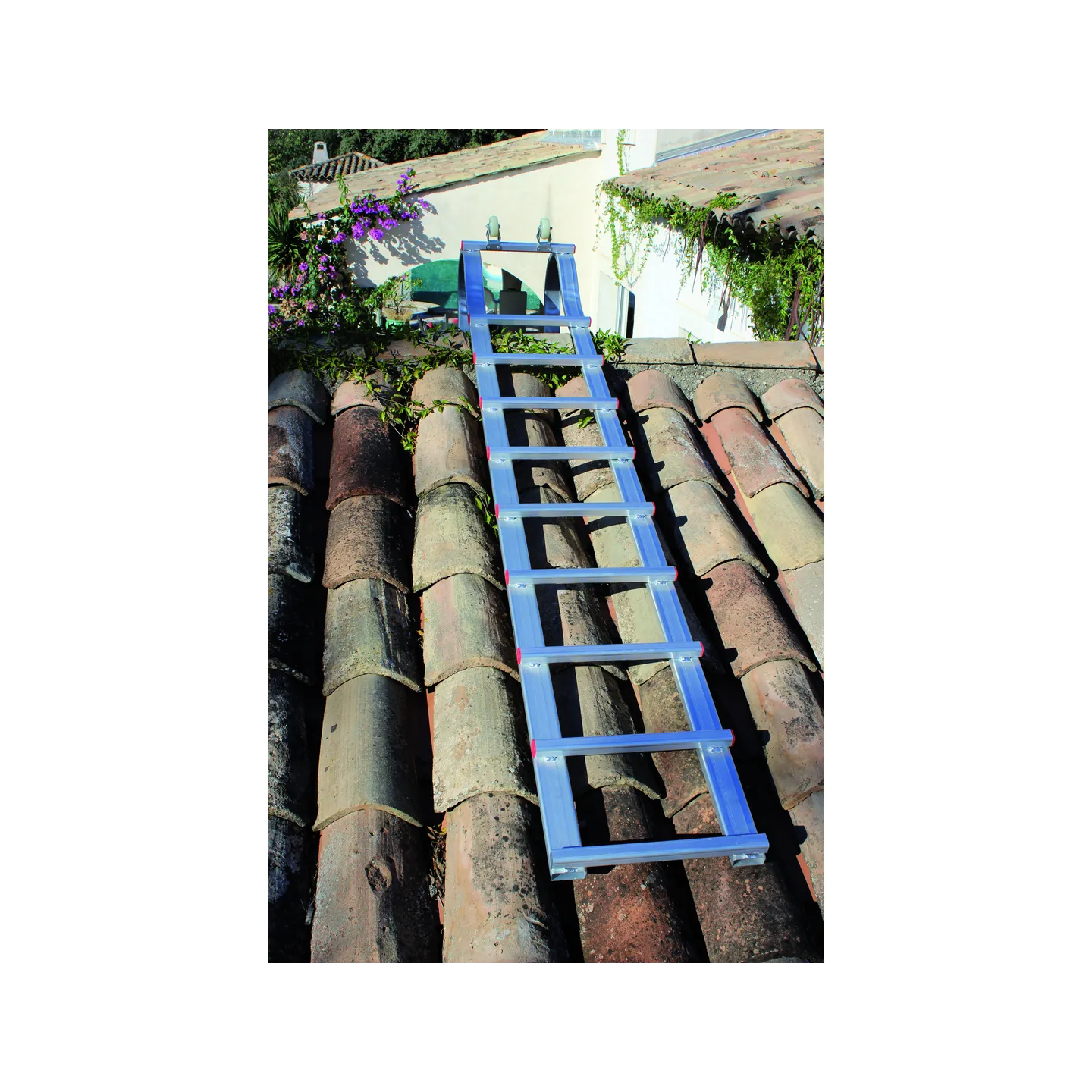 Ensuite, retournez l’échelle et vérifiez que les crochets roulette soient bien fixés en tirant l’échelle vers vous. D’une longueur de 2,30m, cette échelle de couvreur possède un système de connexion simple pour ajouter des éléments de 3 m ou 1,30 m.