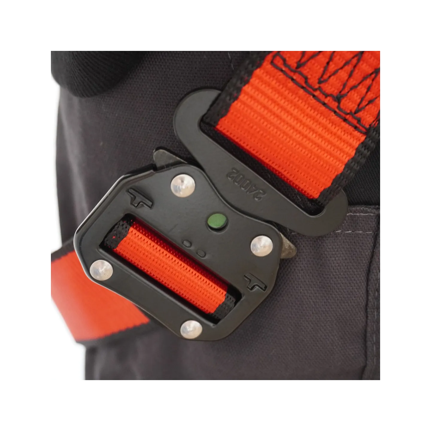 Boucles automatiques sur cuissardes, ceinture et point sternal pour enfiler rapidement le harnais.