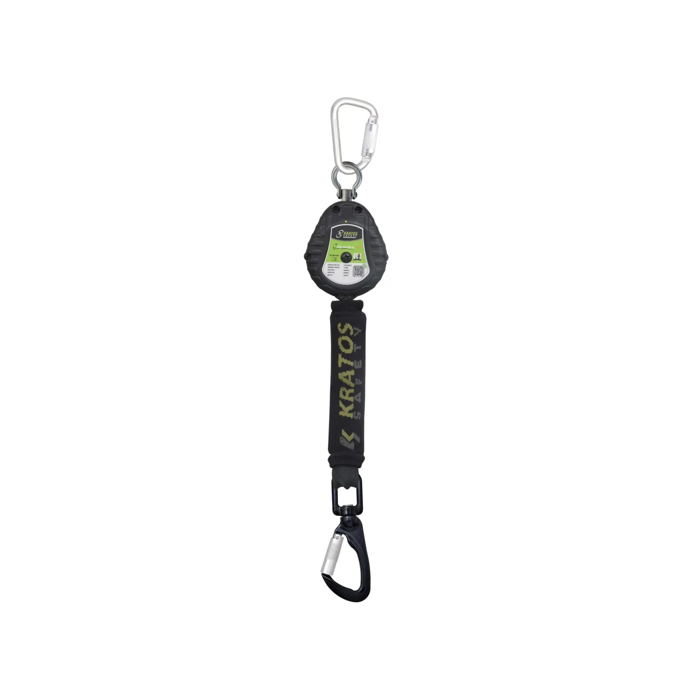 Fourni avec un émerillon et un mousqueton pour connexion sur le point d'ancrage, et un mousqueton avec émerillon pour connexion au harnais. Équipé d'un absorbeur d'énergie externe protégé par une gaine textile amovible.