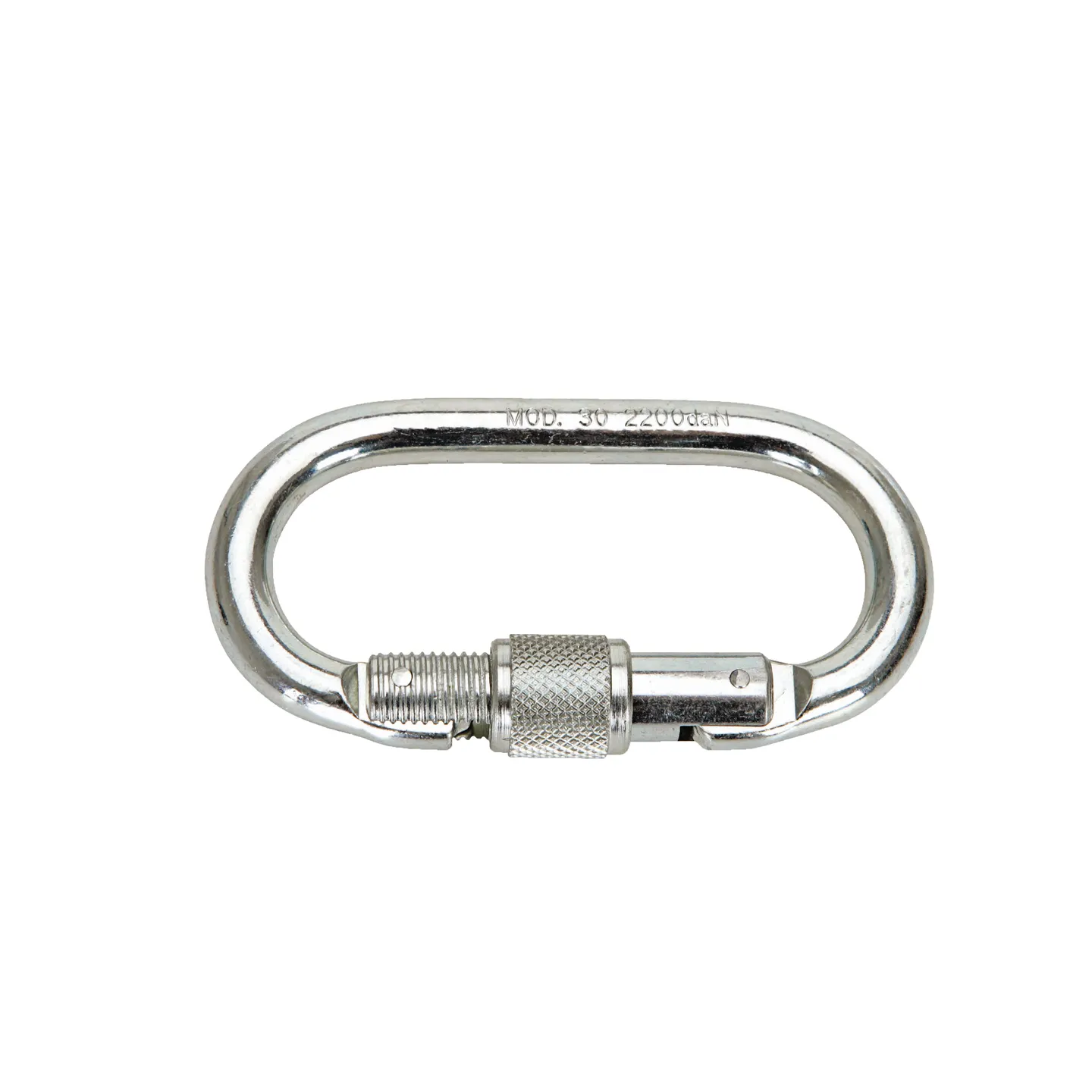 Le mousqueton est un connecteur avec une fermeture à ressort et une bague à verrouillage manuel. Ce système de fermeture évite les ouvertures involontaires ou accidentelles du mousqueton. Tous les composants du mousqueton Corps, broches, ressort et bague de verrouillage à vis sont en acier, avec d’excellentes propriétés mécaniques.