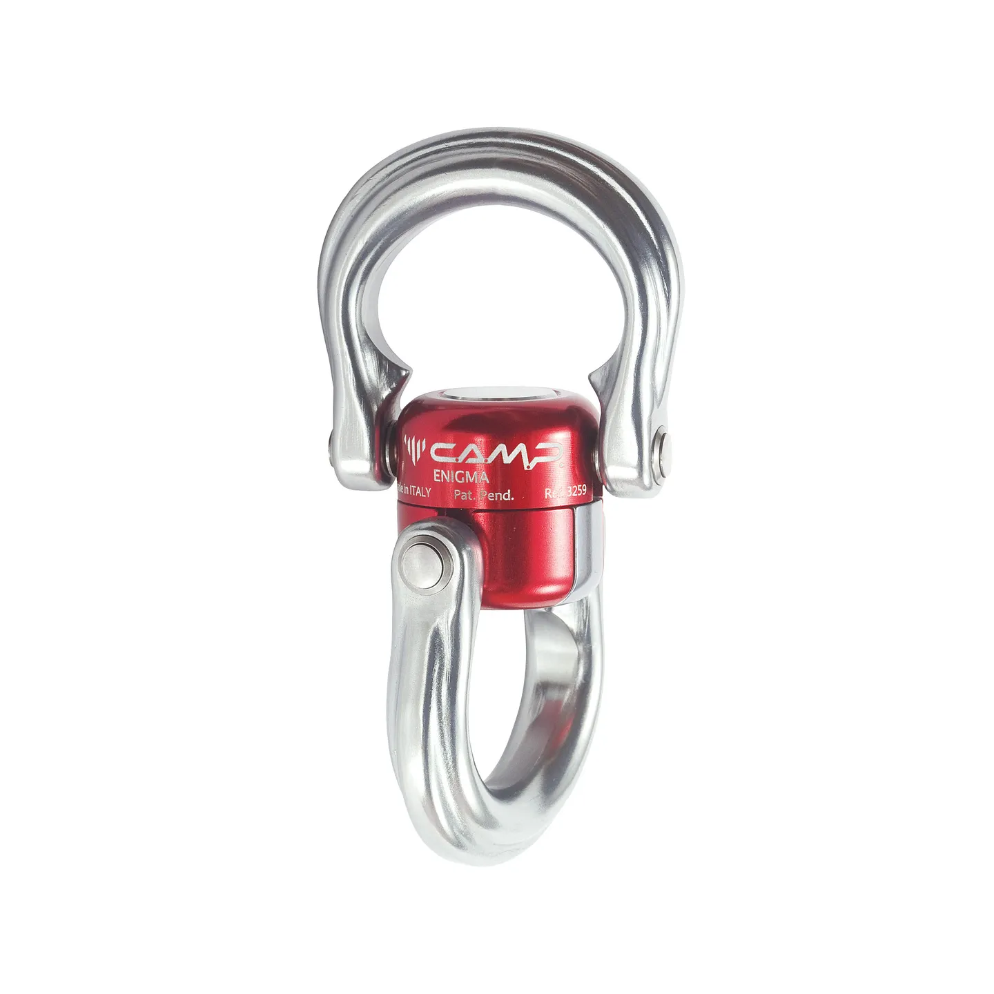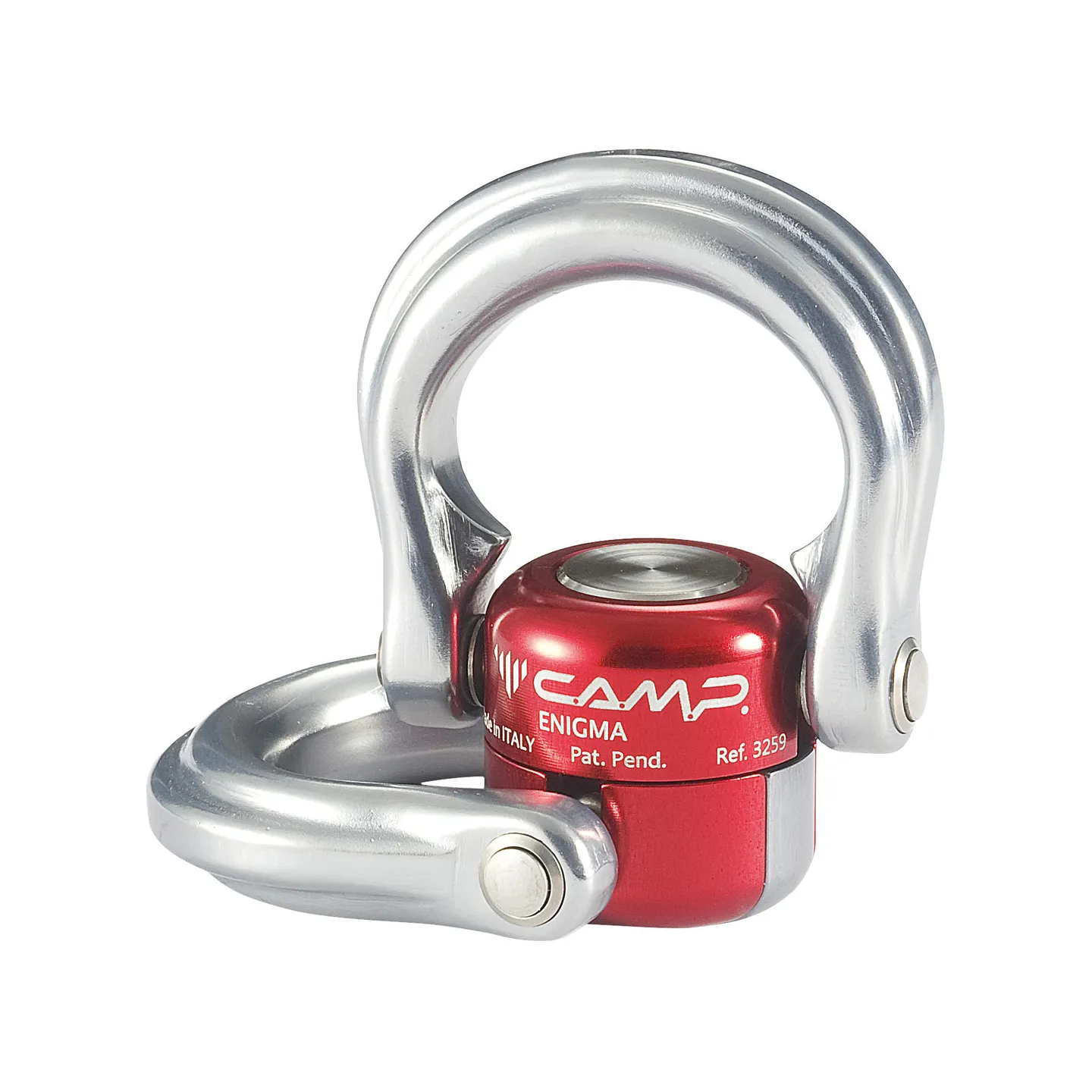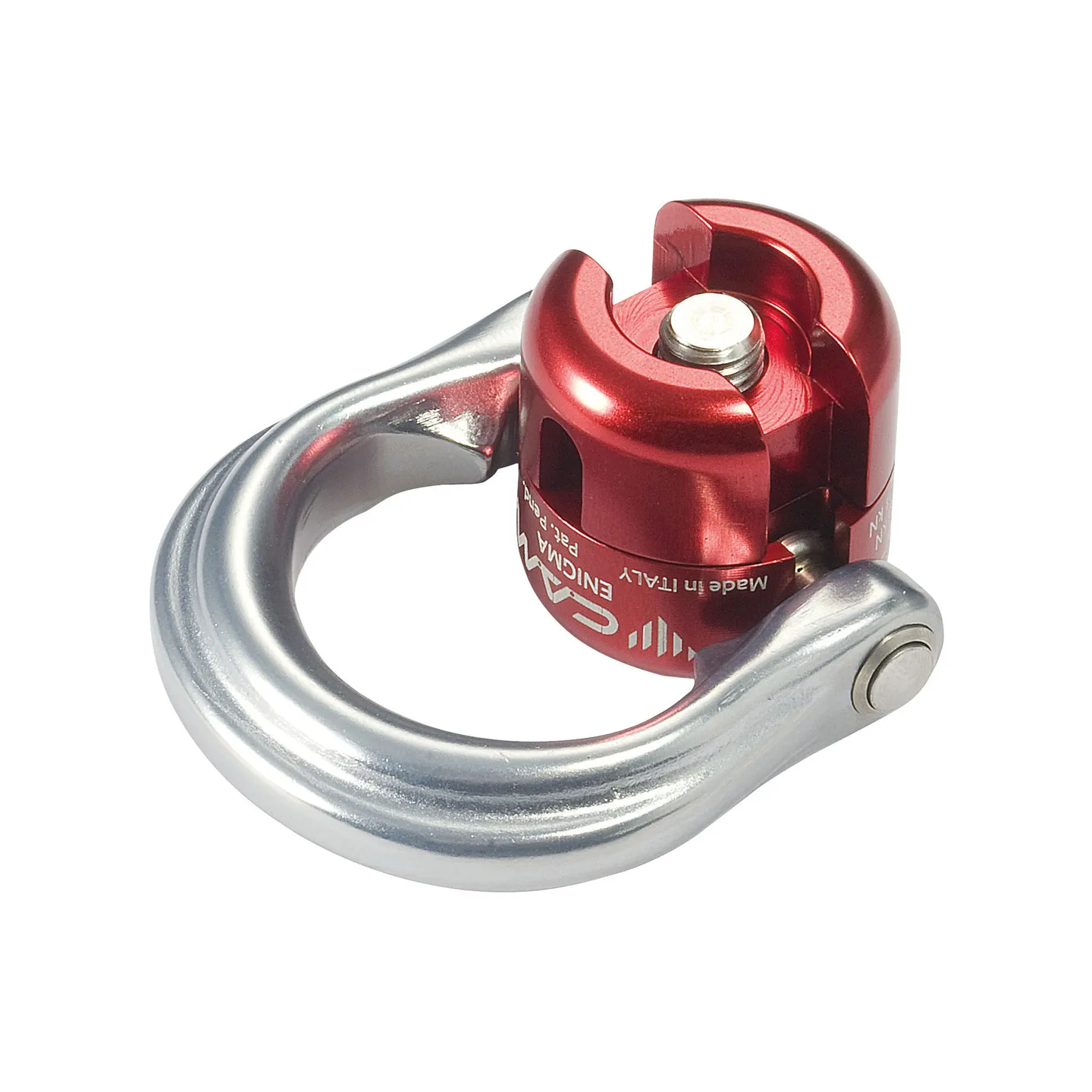 L’Enigma est un dispositif pivotant entièrement ouvrable équipé de grands anneaux basculants qui permettent la connexion directe de composants métalliques et textiles sans l'aide de mousquetons.