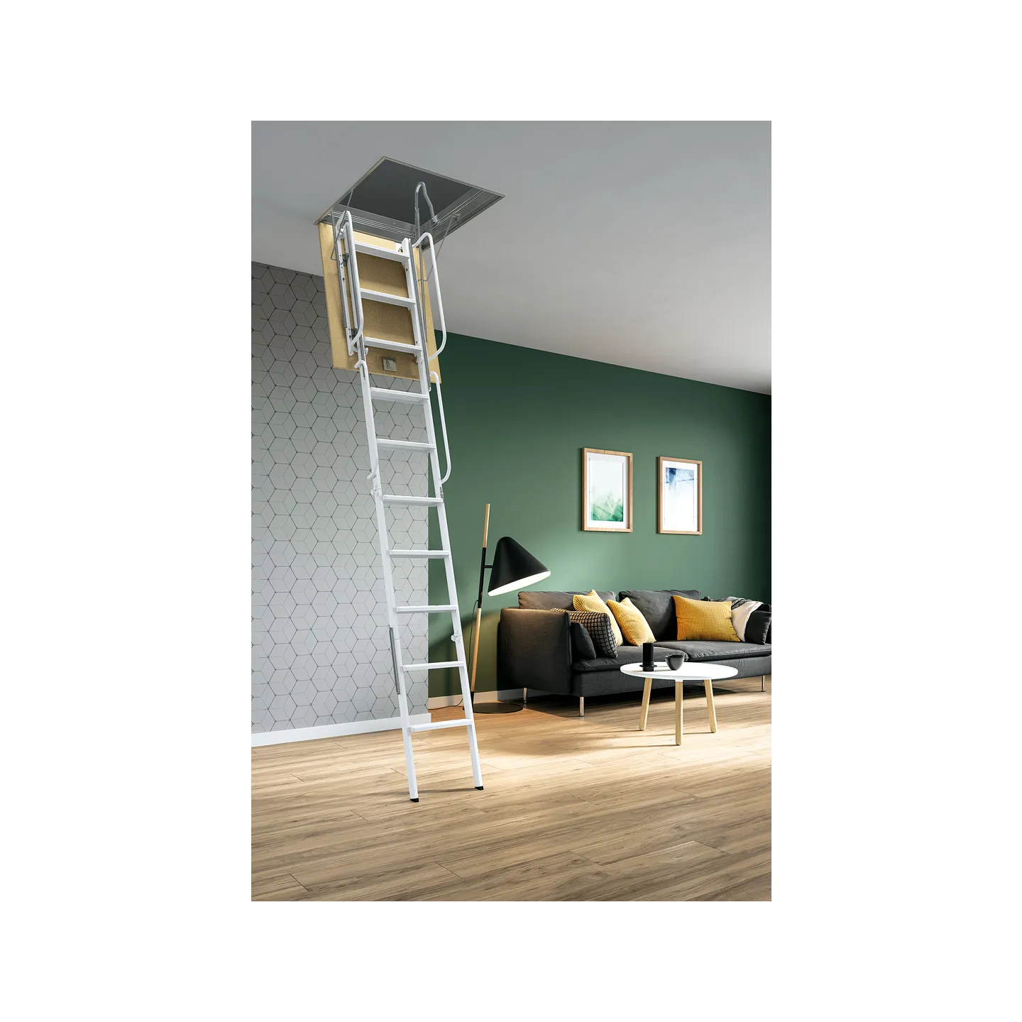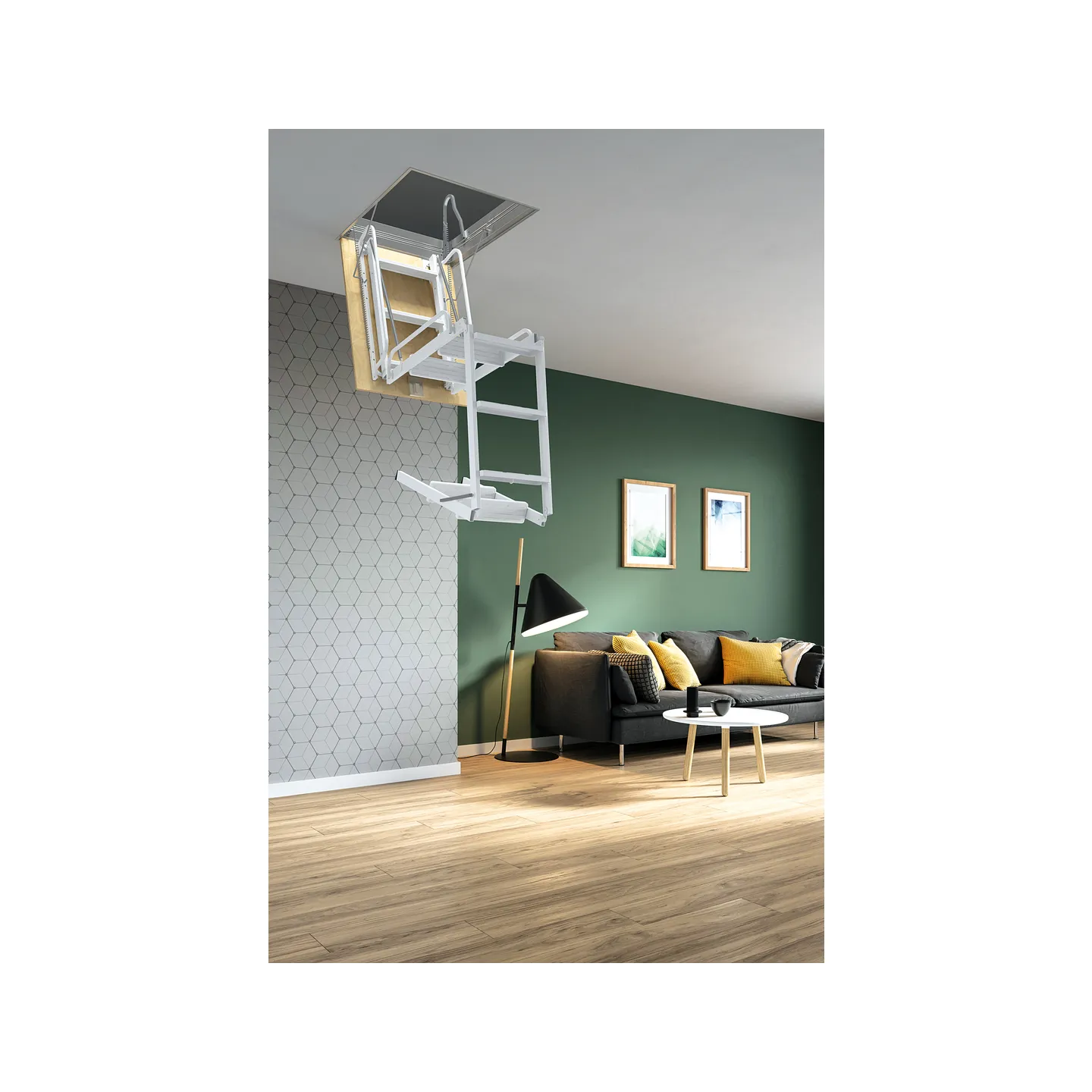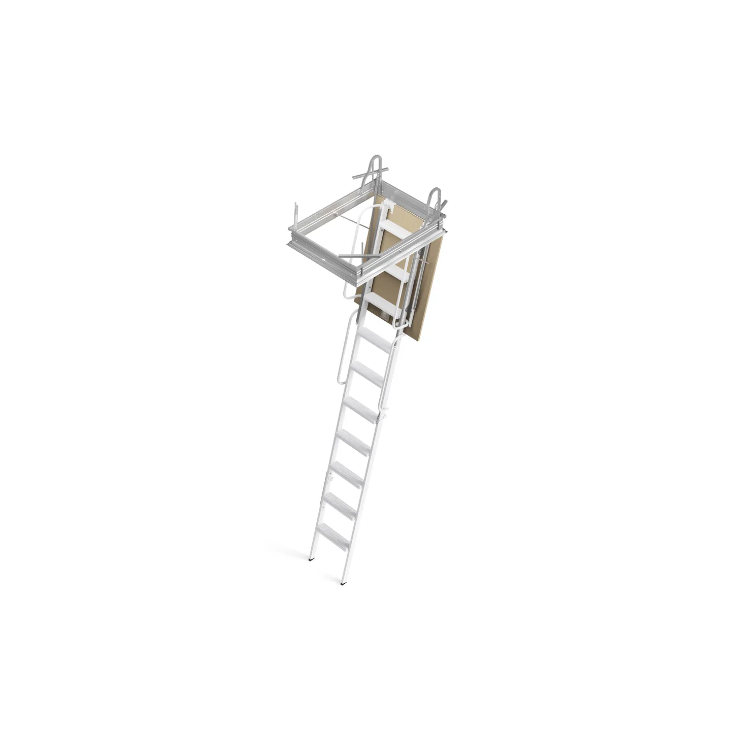 L'escalier escamotable 4PZ droit se compose d'une structure rigide à 4 éléments mobiles composé de 10 marches en acier vernis blanc RAL 9010 et d'un caisson galvanisé.