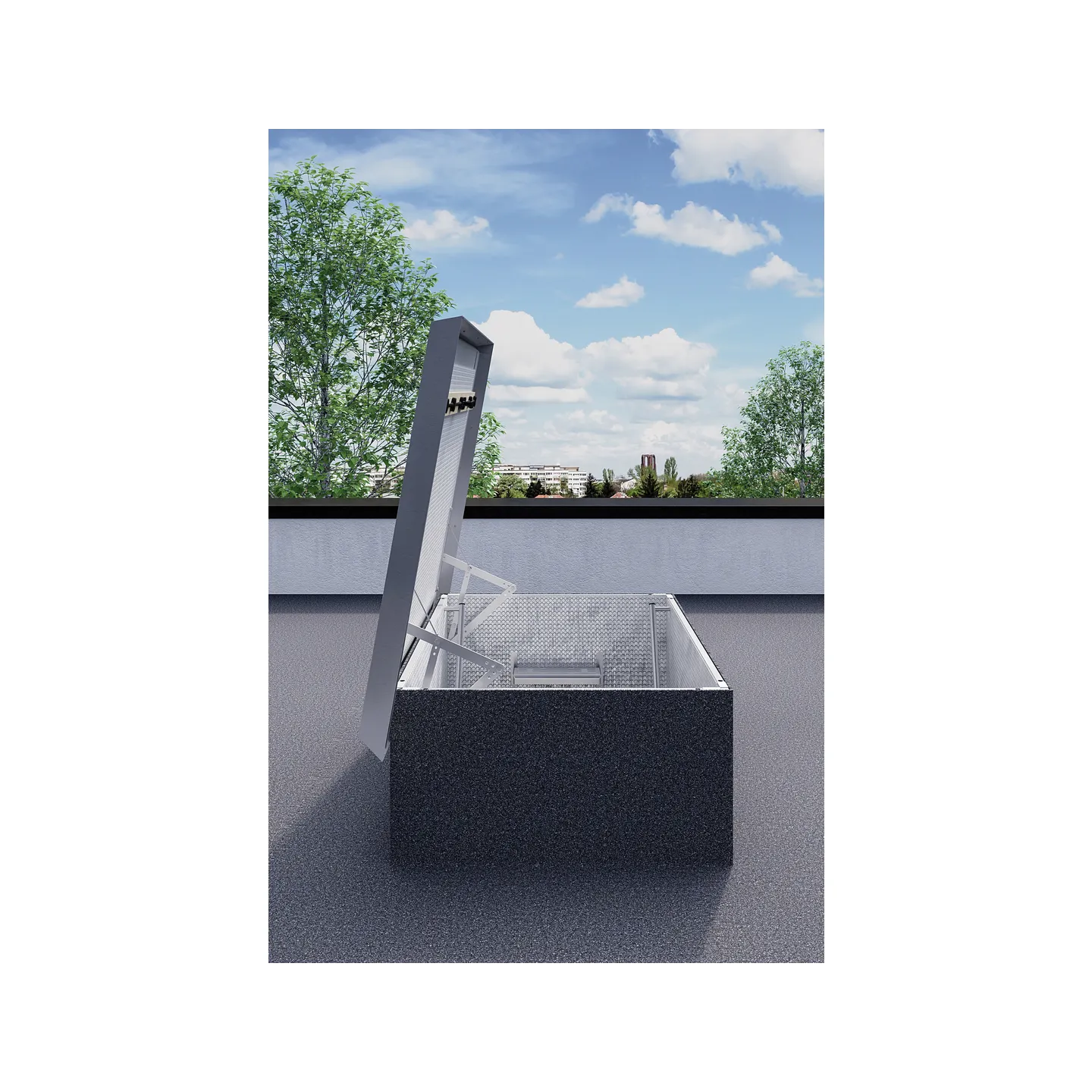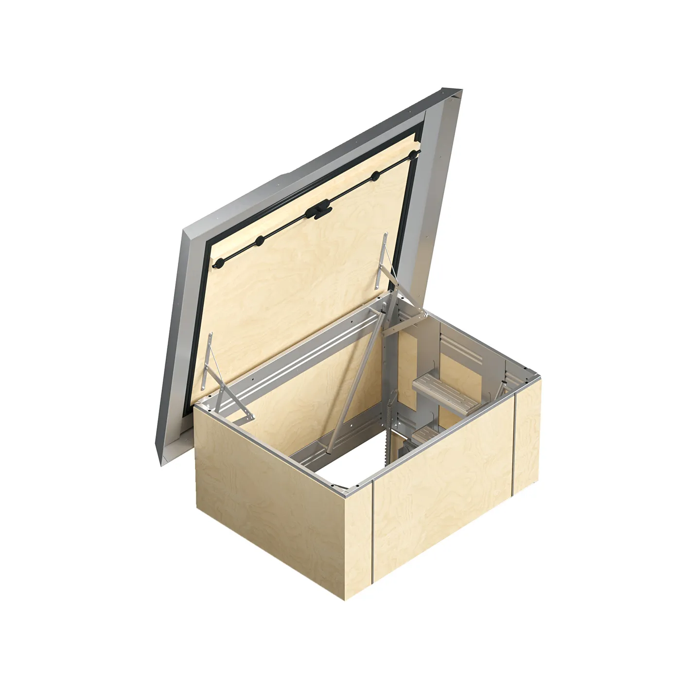 Structure d'accès au toit : caisson interne en contreplaqué et couverture du couvercle en acier galvanisé 10/10. Panneau contreplaqué en peuplier de premier choix, 15 mm d'épaisseur