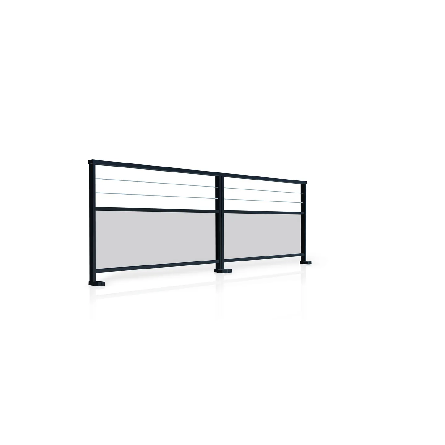 Remplissage vitrage 44,2 clair autres vitrages possible pris dans un joint portefeuille dans lisse basse et haute rectangulaire 27 x 50 mm, câbles inox diamètres 6 mm