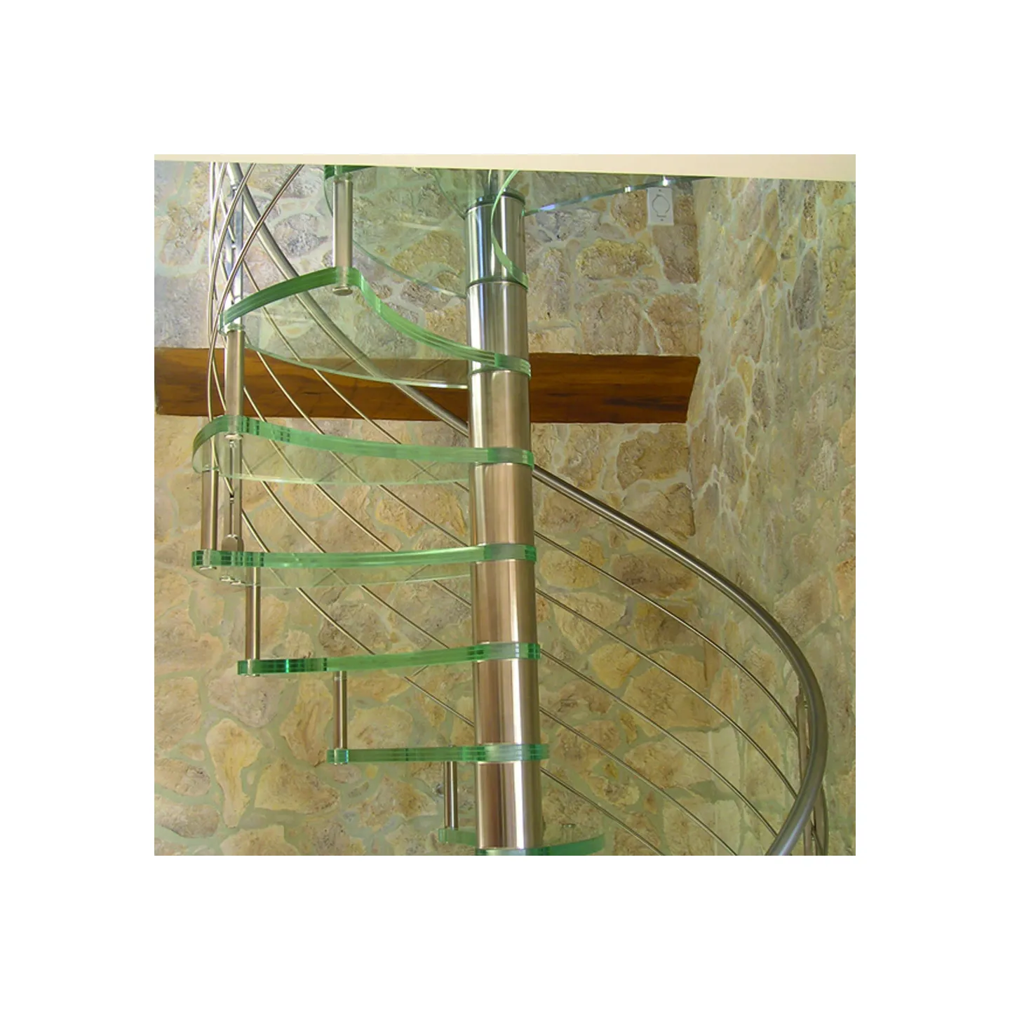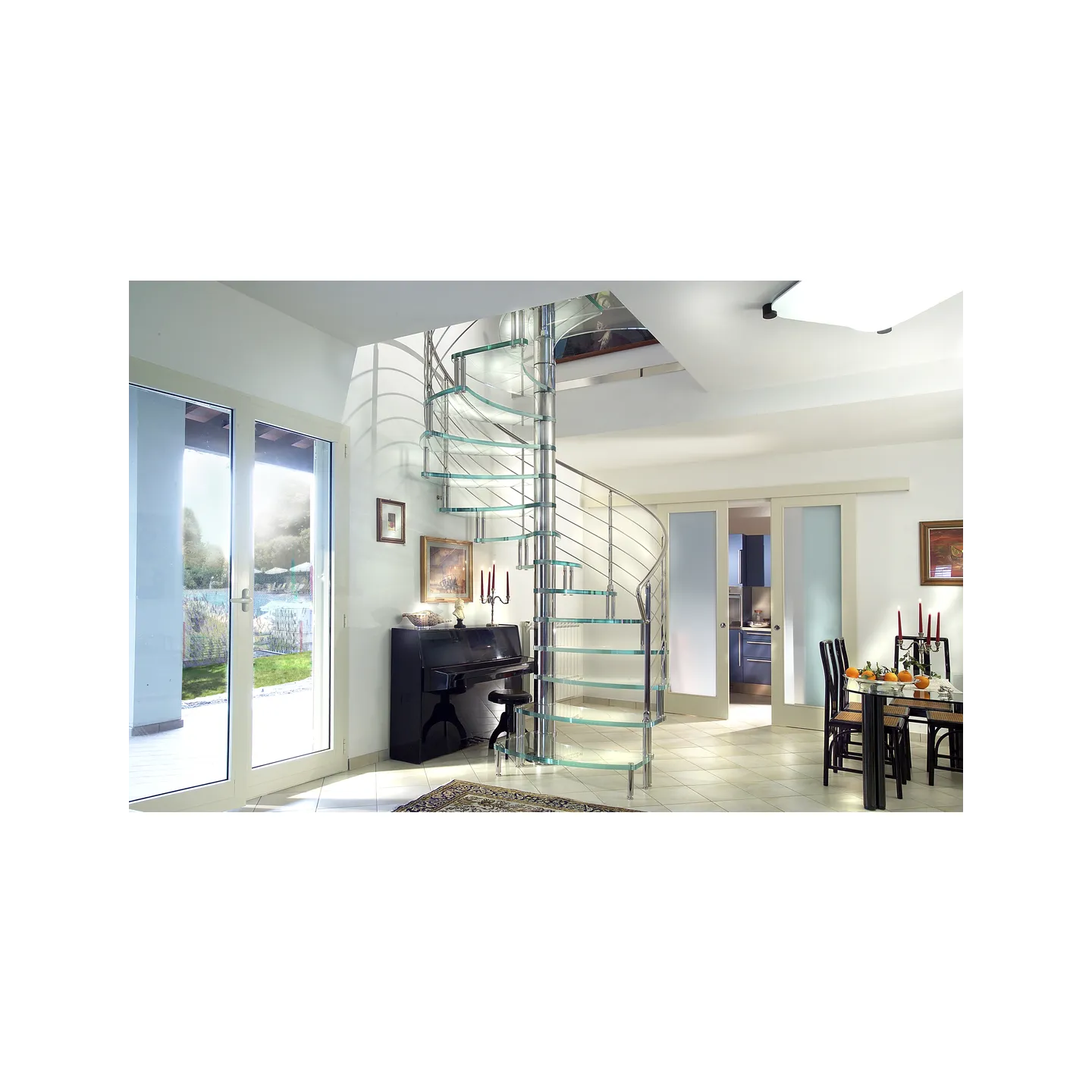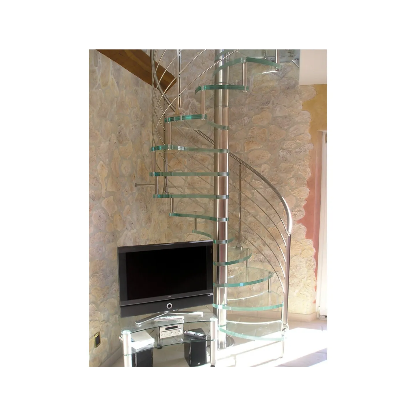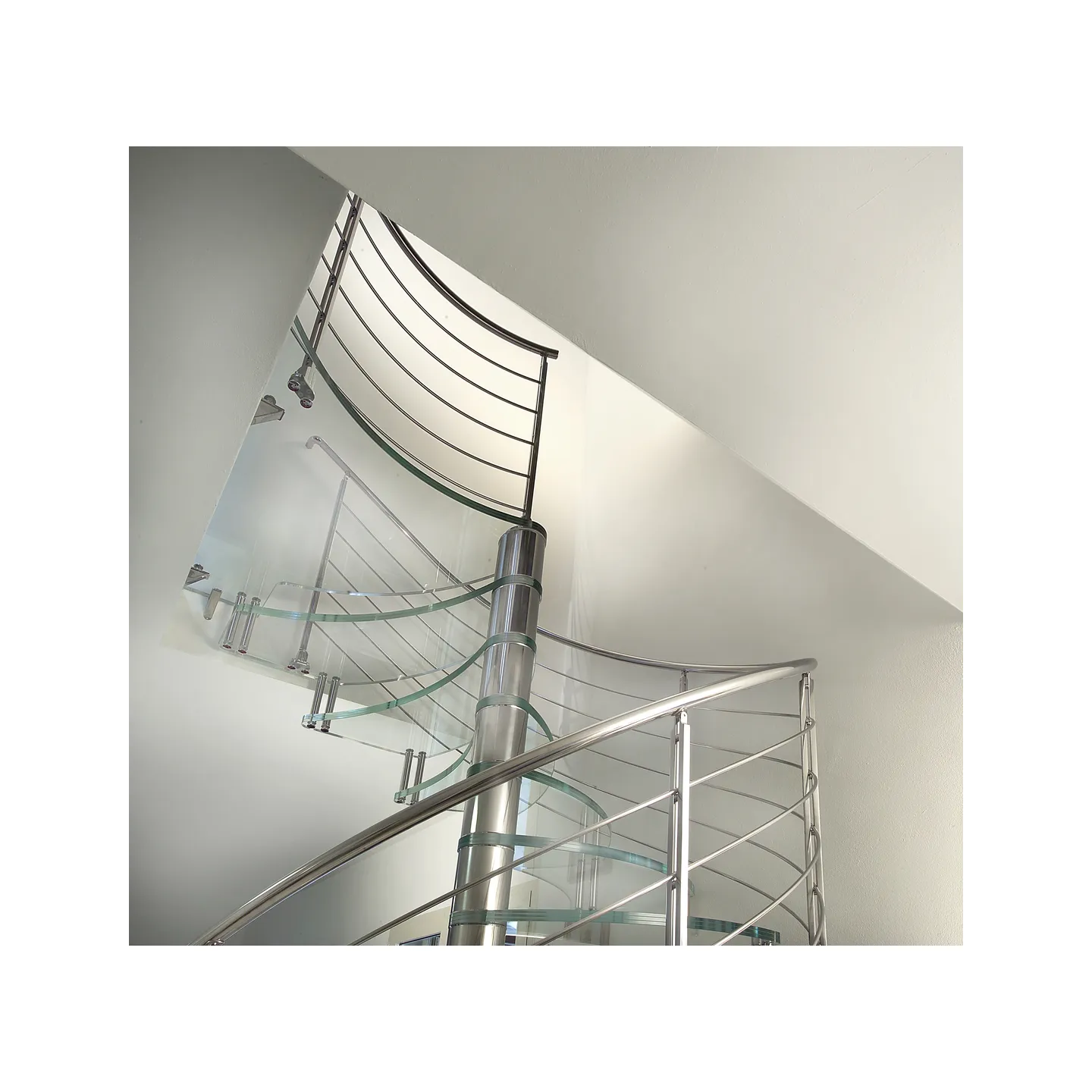 Escalier haut de gamme en colimaçon avec marches en verre pour un intérieur contemporain.