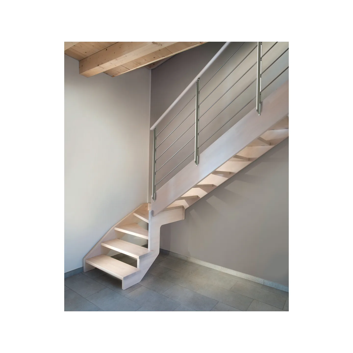 Escalier d’intérieur à double limon latéral composé de bois d'hêtre et d'une rampe en acier inox apportant modernité et légèreté à votre habitat.
