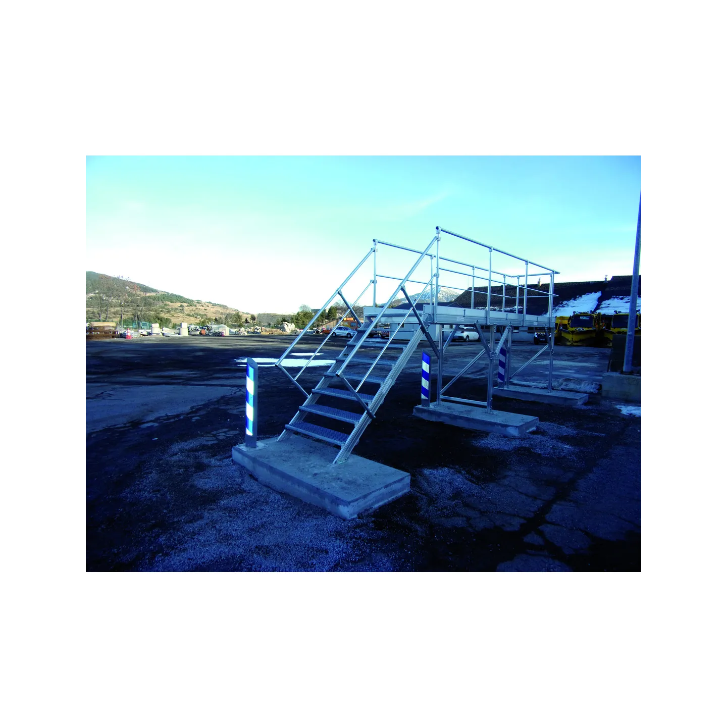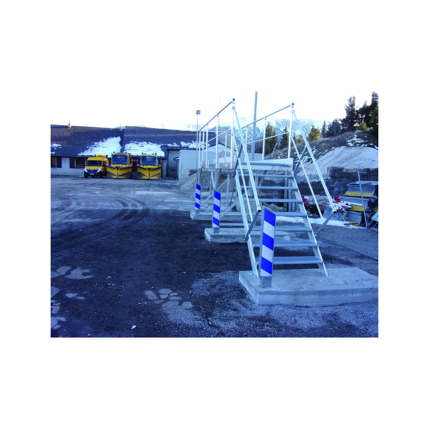 Platelage de type caillebottis antidérapant en acier galvanisé pour gérer les contraintes d'enneigement et de corrosion du sel.
