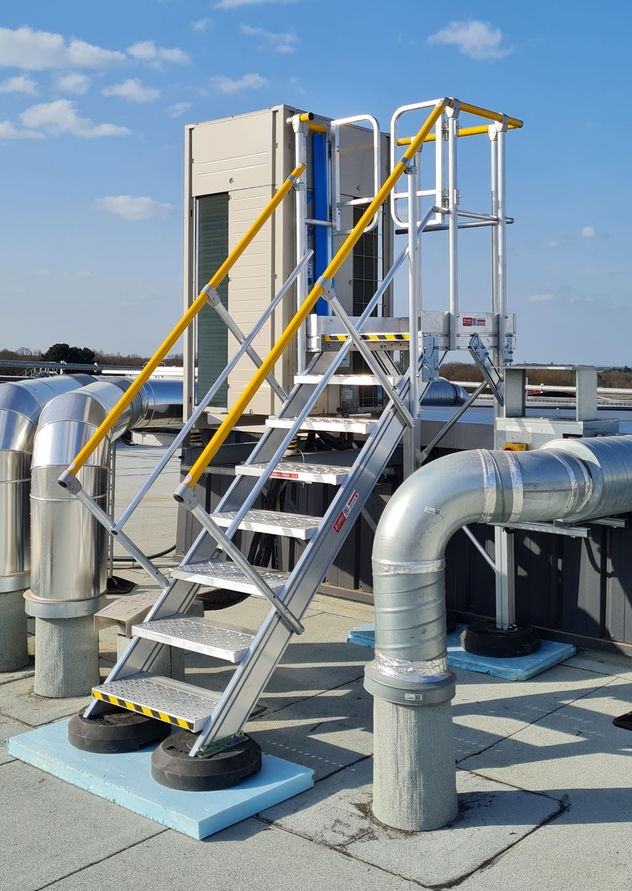 L'équipe de pose de l'agence nantaise a fourni et posé des plates-formes avec escaliers en fabrication sur-mesure de la gamme LEEVEL sur le toit du bâtiment