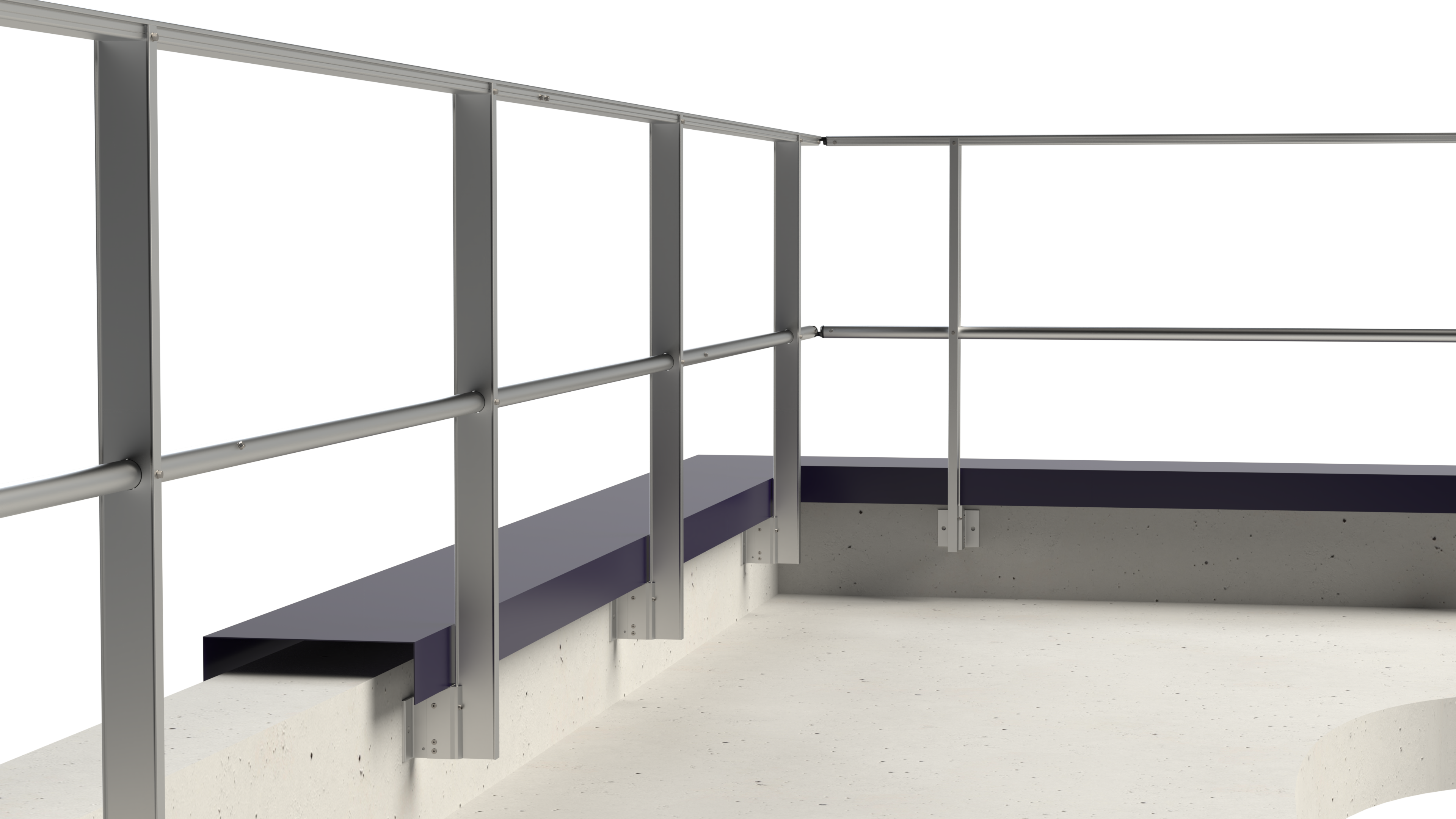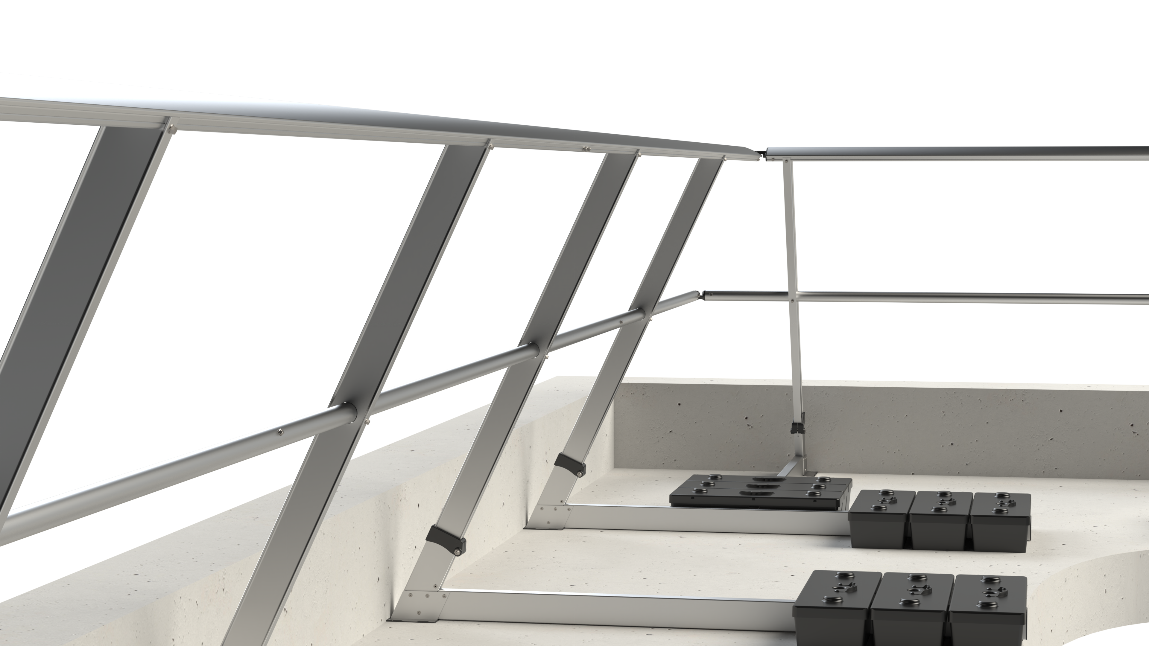 Afin de vous garantir le respect total de la norme NF E85-015 : 2019, nous avons adapté le garde-corps autoportant FASTGUARD® avec une jambe de force renforcée ainsi qu’un lestage composé de 3 plots de 12,5 kg par jambe de force.
