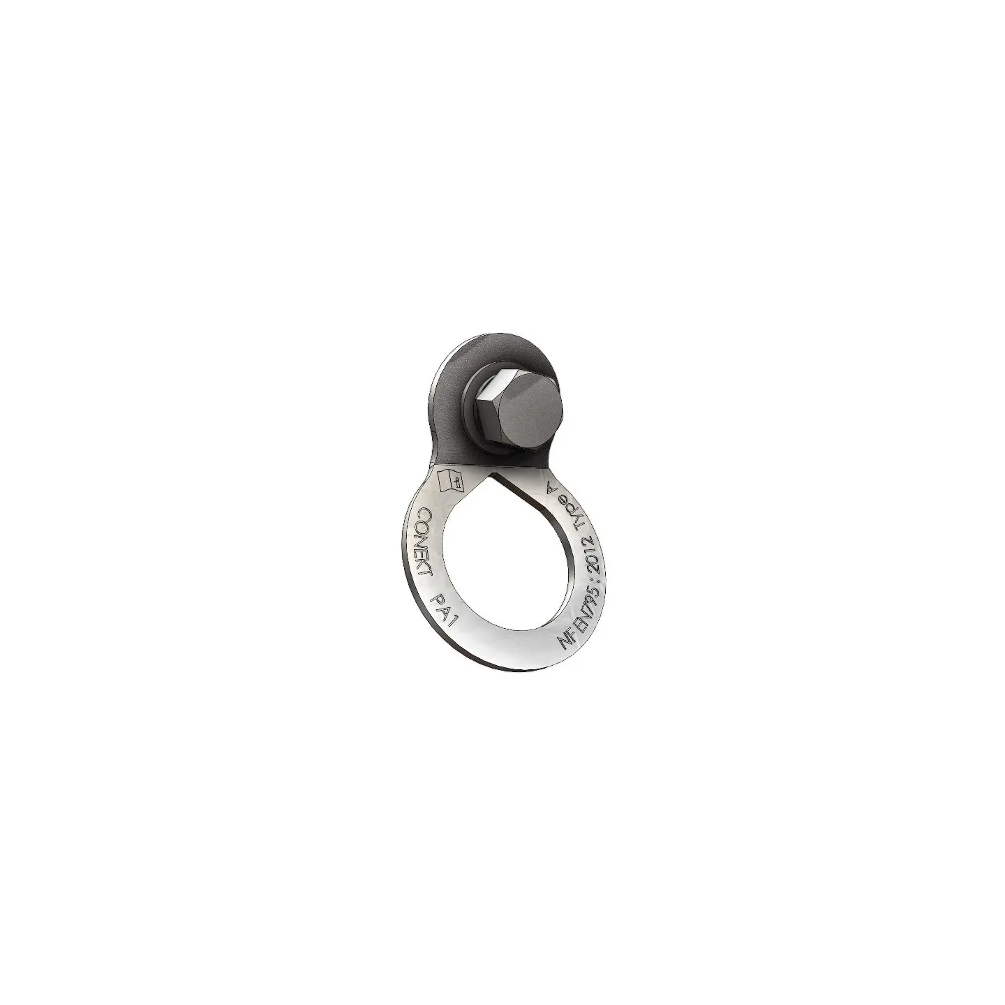 Plaquette d’ancrage avec entretoise permettant une libre rotation. Grace à son ouverture de 40mm, cet ancrage peut être utilisé avec tout type de mousqueton, y compris les mousquetons grande ouverture.