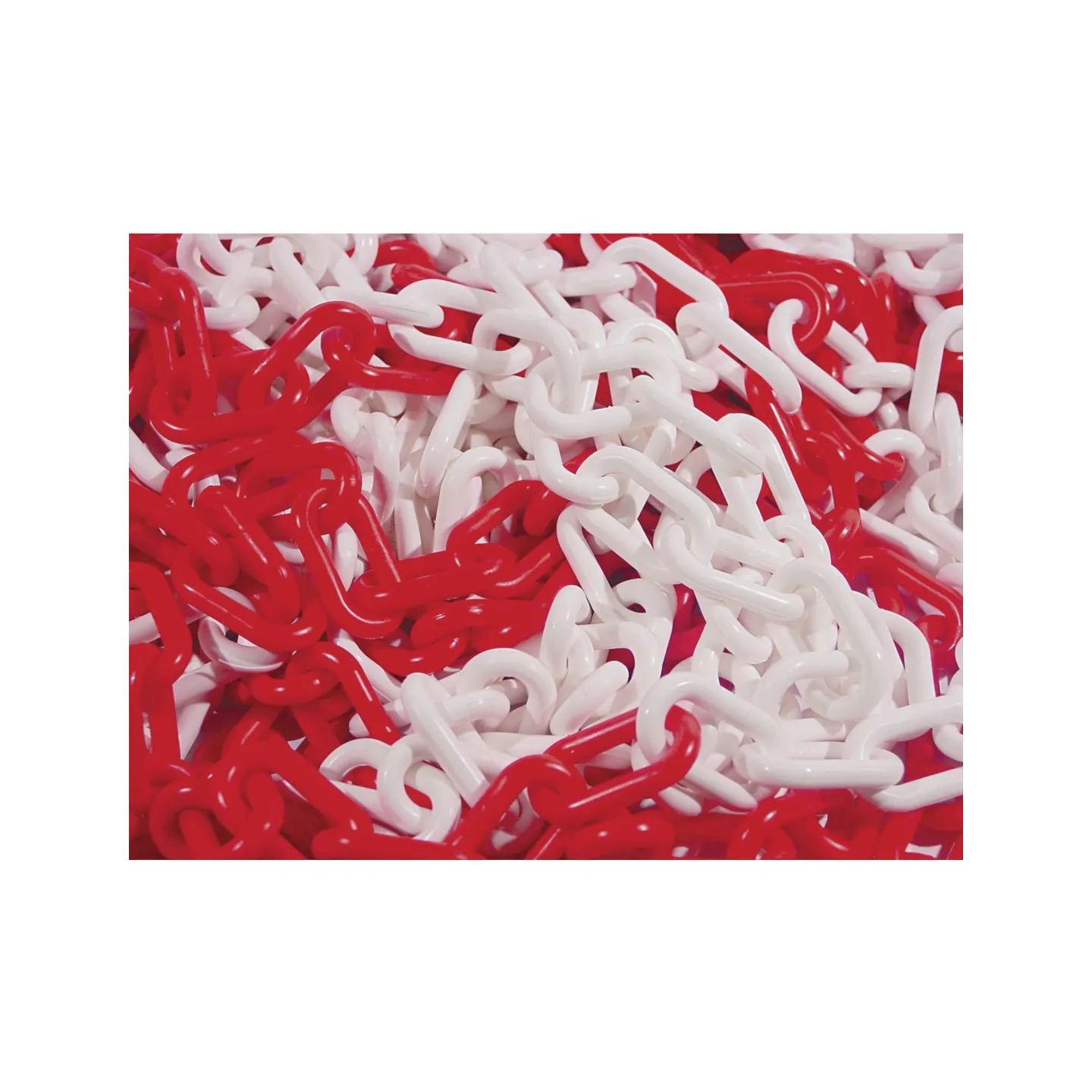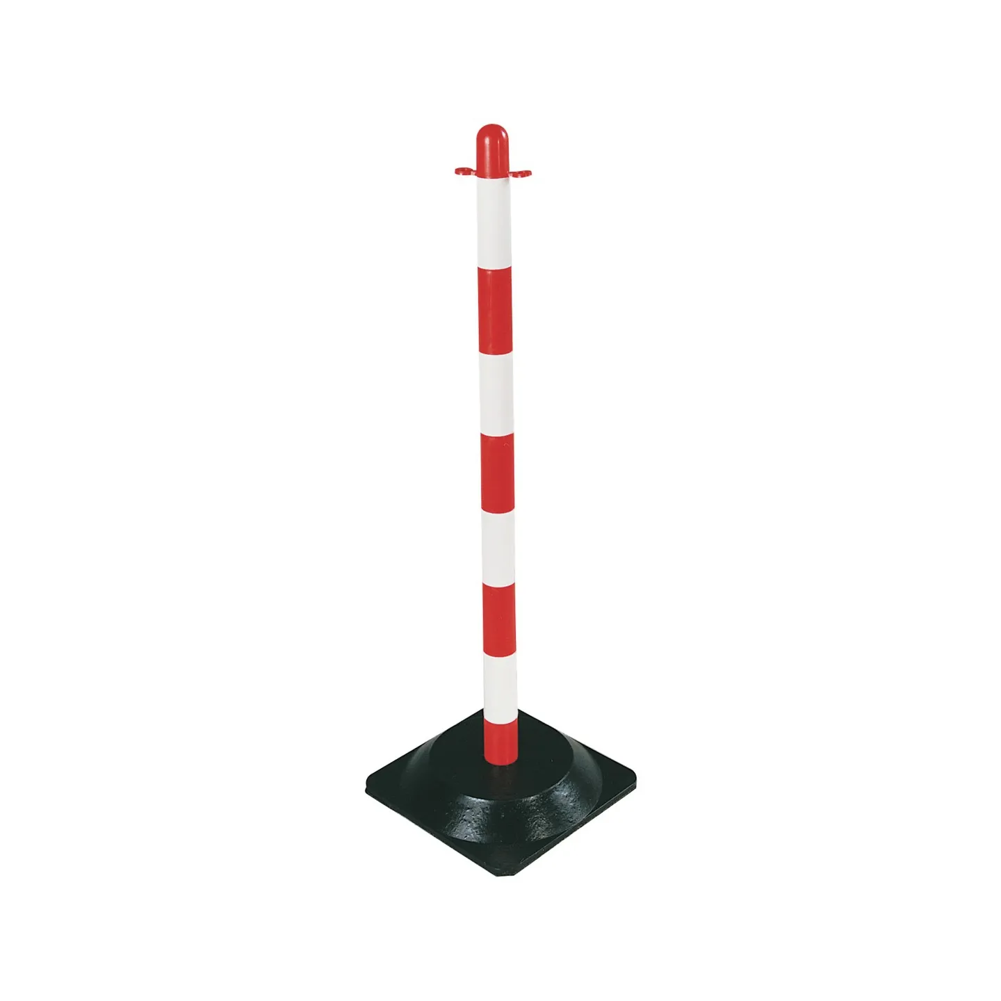 Potelets en matière plastique rouge et blanc diamètre 4 cm, montés sur pieds caoutchouc noirs