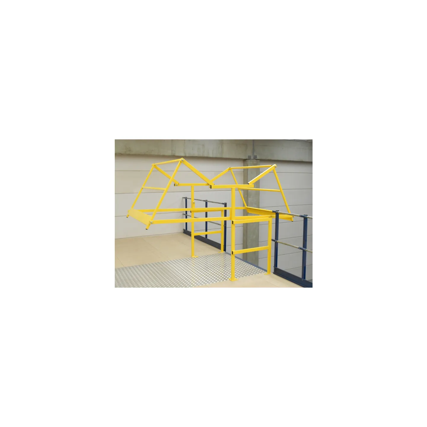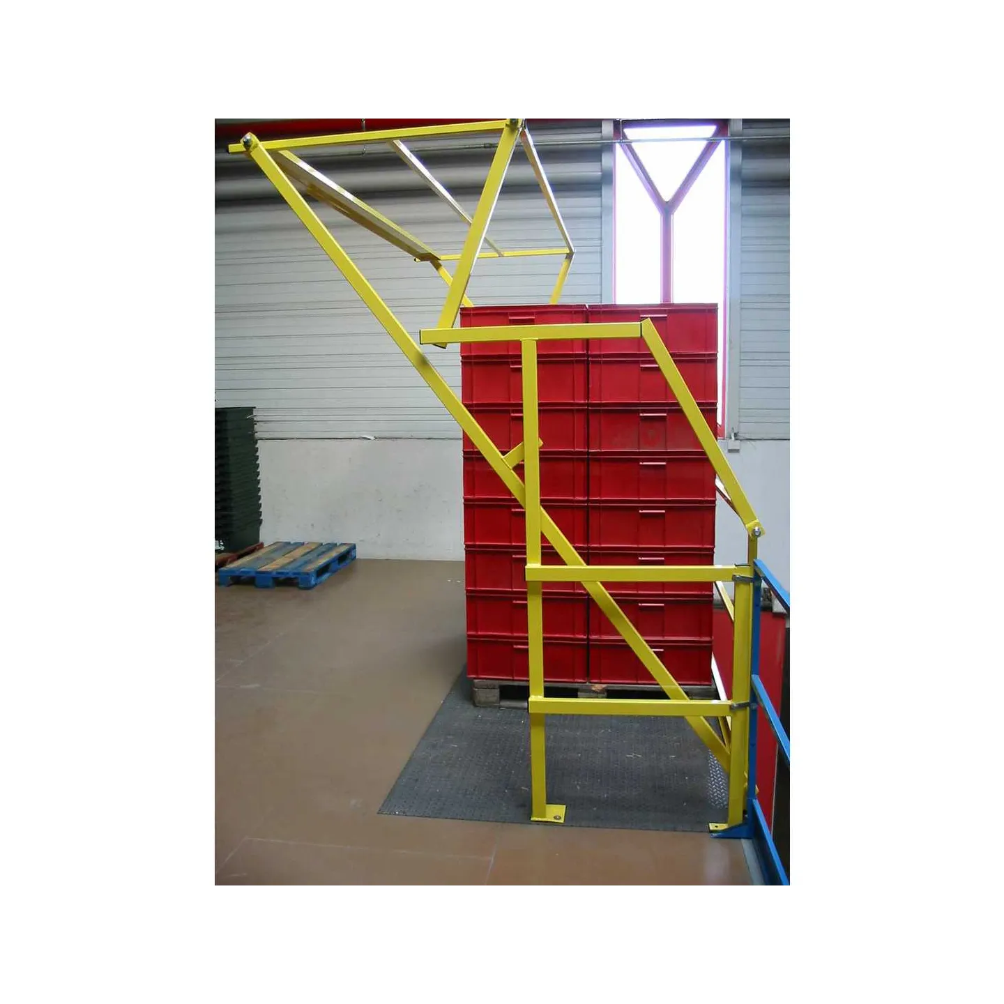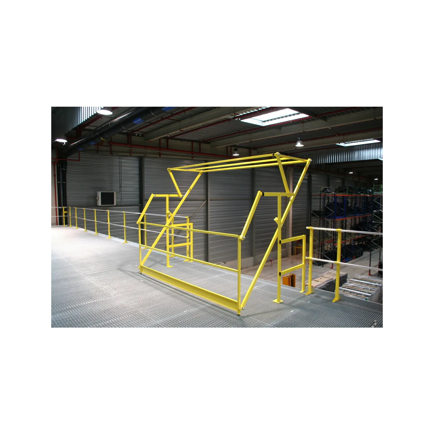 Les barrière écluse type sas à volet permettent de sécuriser les zones de transfert de marchandises entre niveaux en assurant la continuité des garde-corps.