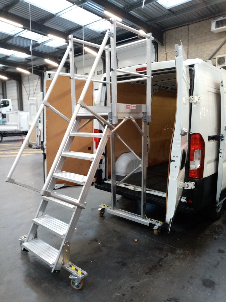 L'entreprise IVECO NORD à Steenvoorde s'est équipée de 2 plates-formes RIS de 3 et 7 marches pour sécuriser le travail en hauteur au niveau des fourgons, leur permettant un travail en étant à l'aise et bien stable.