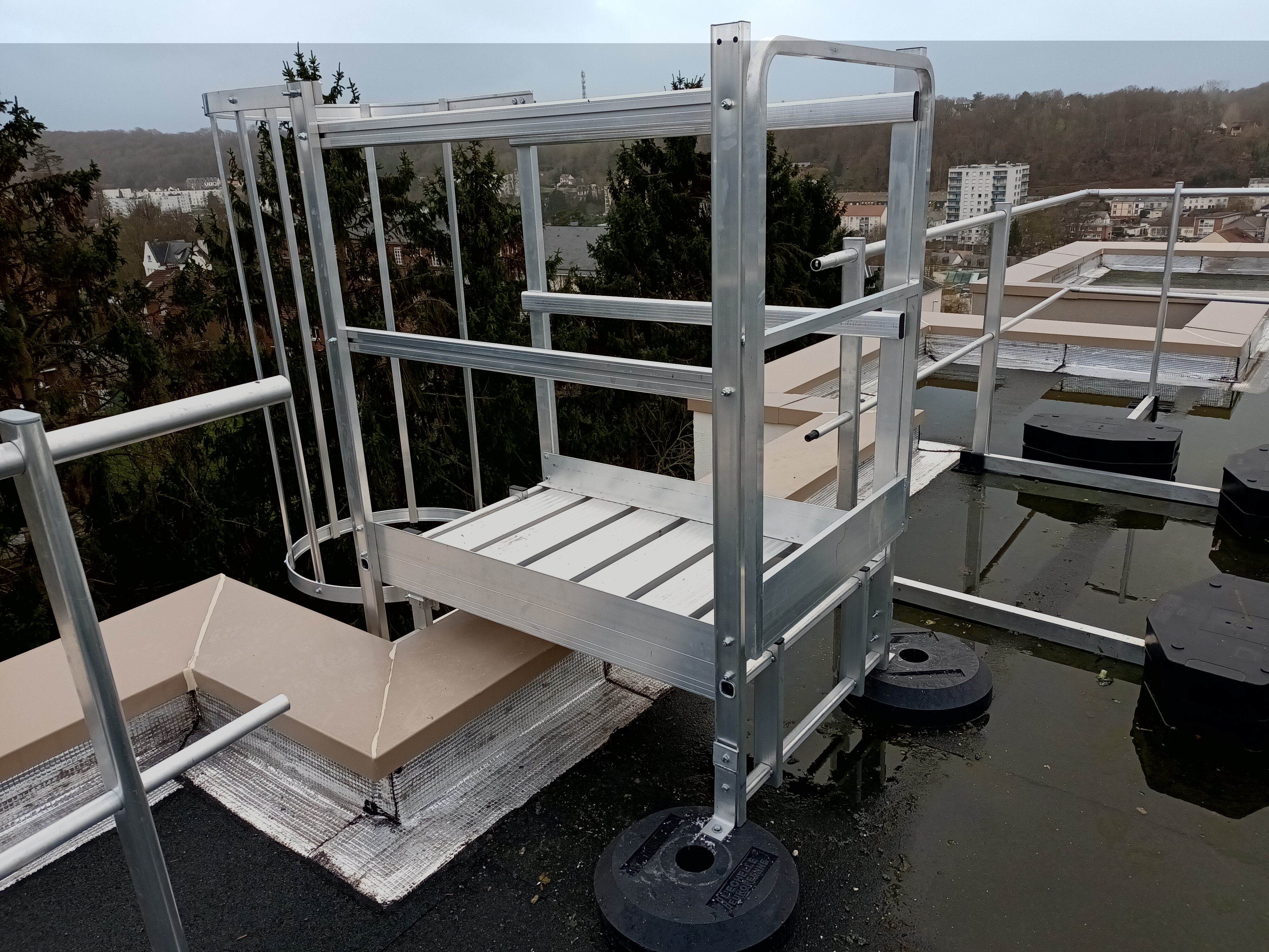 Echelles à crinoline avec passage d’acrotère en aluminium, pose sur béton et plots résine, et raccords sur garde-corps en aluminium, pose sur béton et plots résine, et raccords sur garde-corps en aluminium