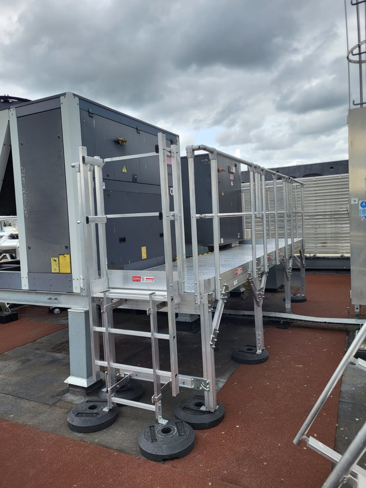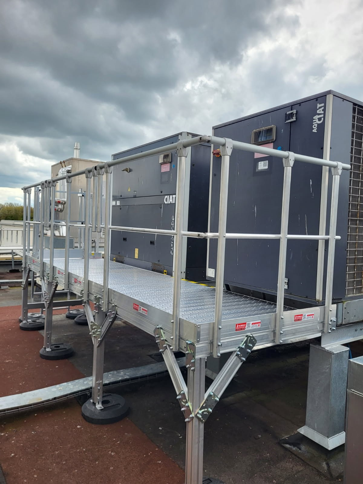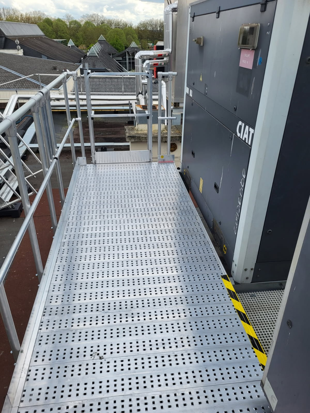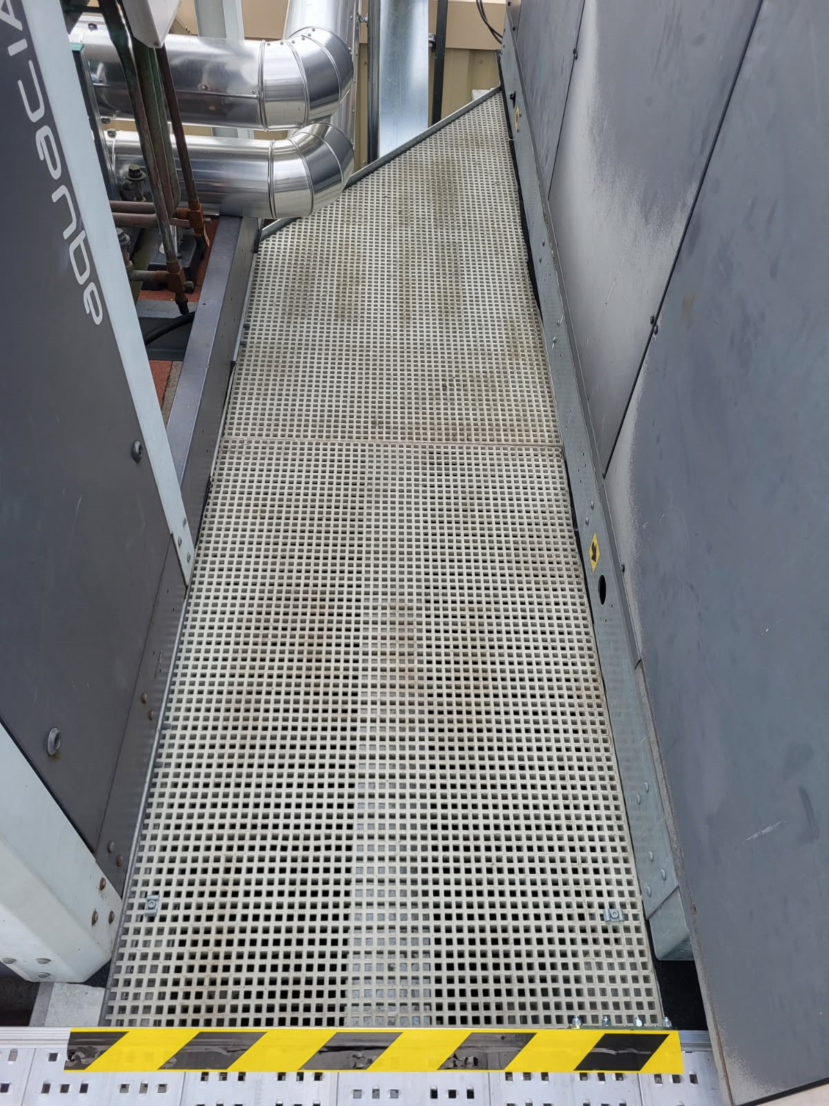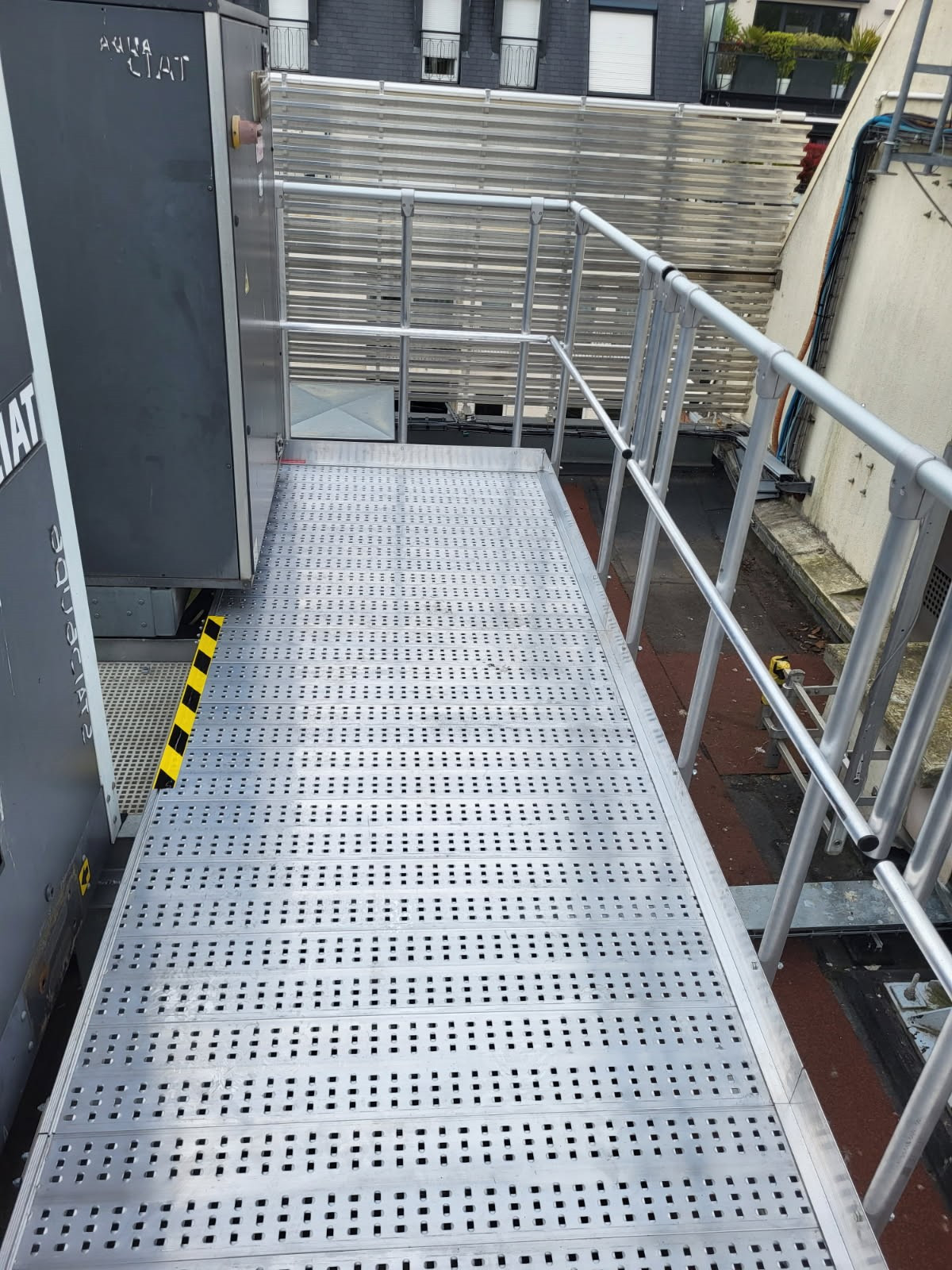 Cette plateforme, destinée à assurer la maintenance des équipements en toiture, a été fixée directement sur les pieds existants des CTA. Entre les deux groupes, un plancher en fibre a été ajouté pour permettre un passage sûr et stable.
