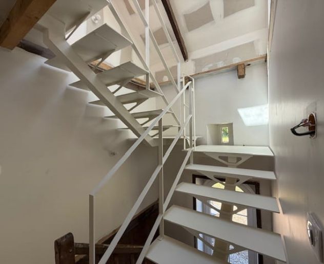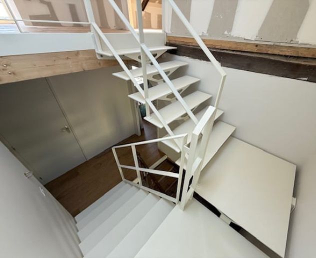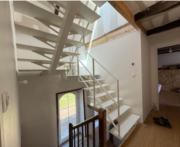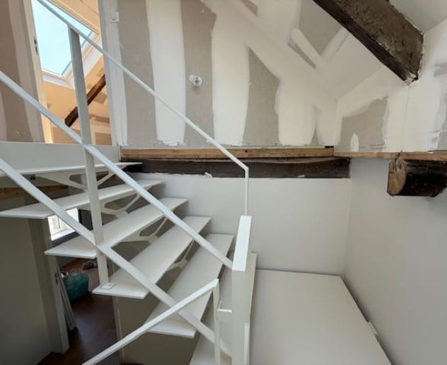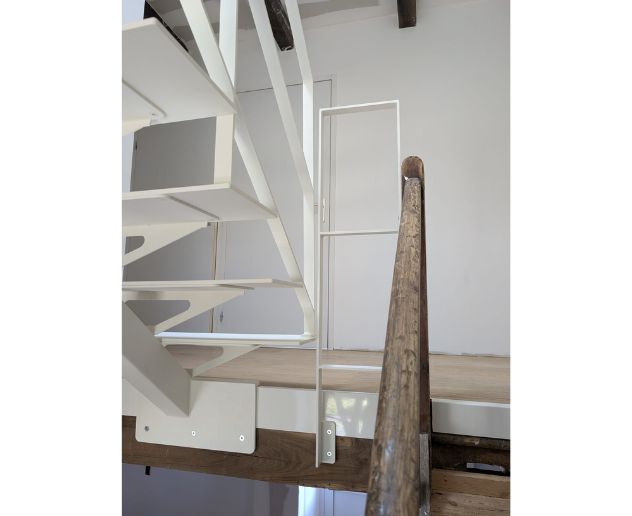 La particularité de ce chantier réside dans sa configuration : l’escalier a été installé au-dessus d’un escalier existant. Cette conception répond à plusieurs objectifs :