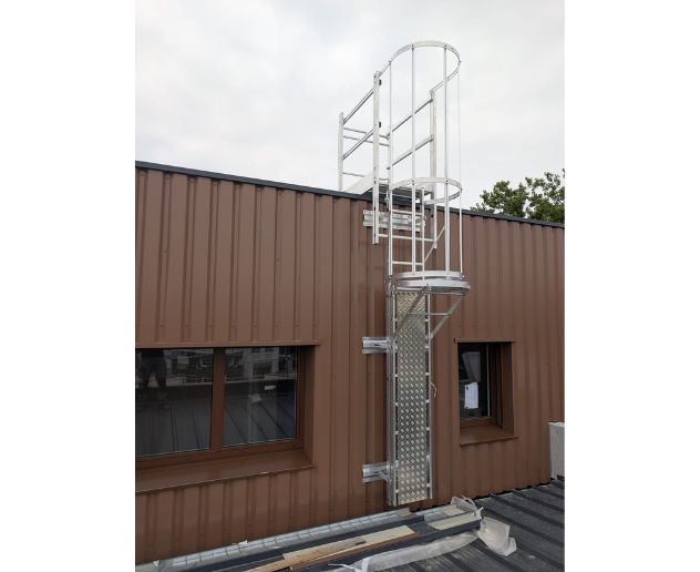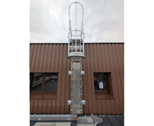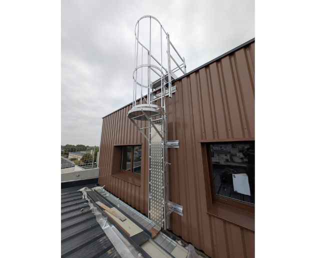 Une échelle a crinoline avec porte de condamnation sur bardage métallique pensée pour la sécurité