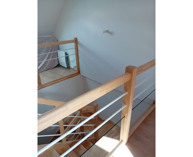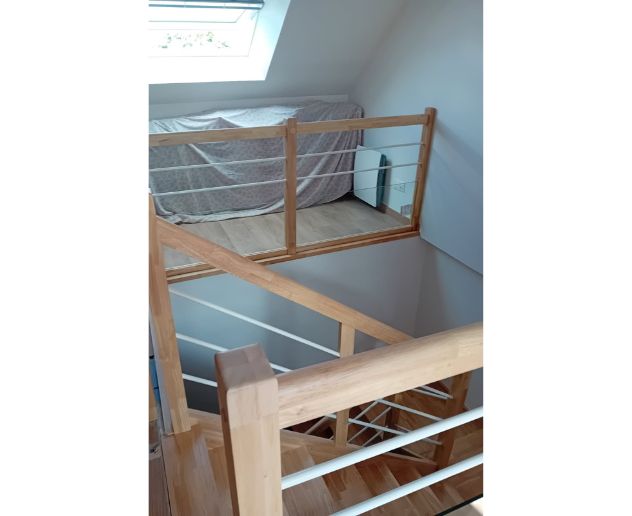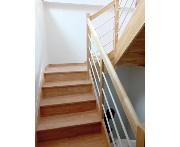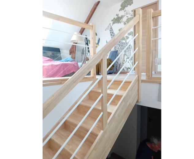 L’escalier installé est conçu en bois d’hévéa, reconnu pour sa stabilité et sa résistance en usage quotidien. La finition vernis mat apporte un rendu moderne et discret, tout en facilitant l’entretien et en renforçant la protection du bois contre les micro-rayures et l’usure.