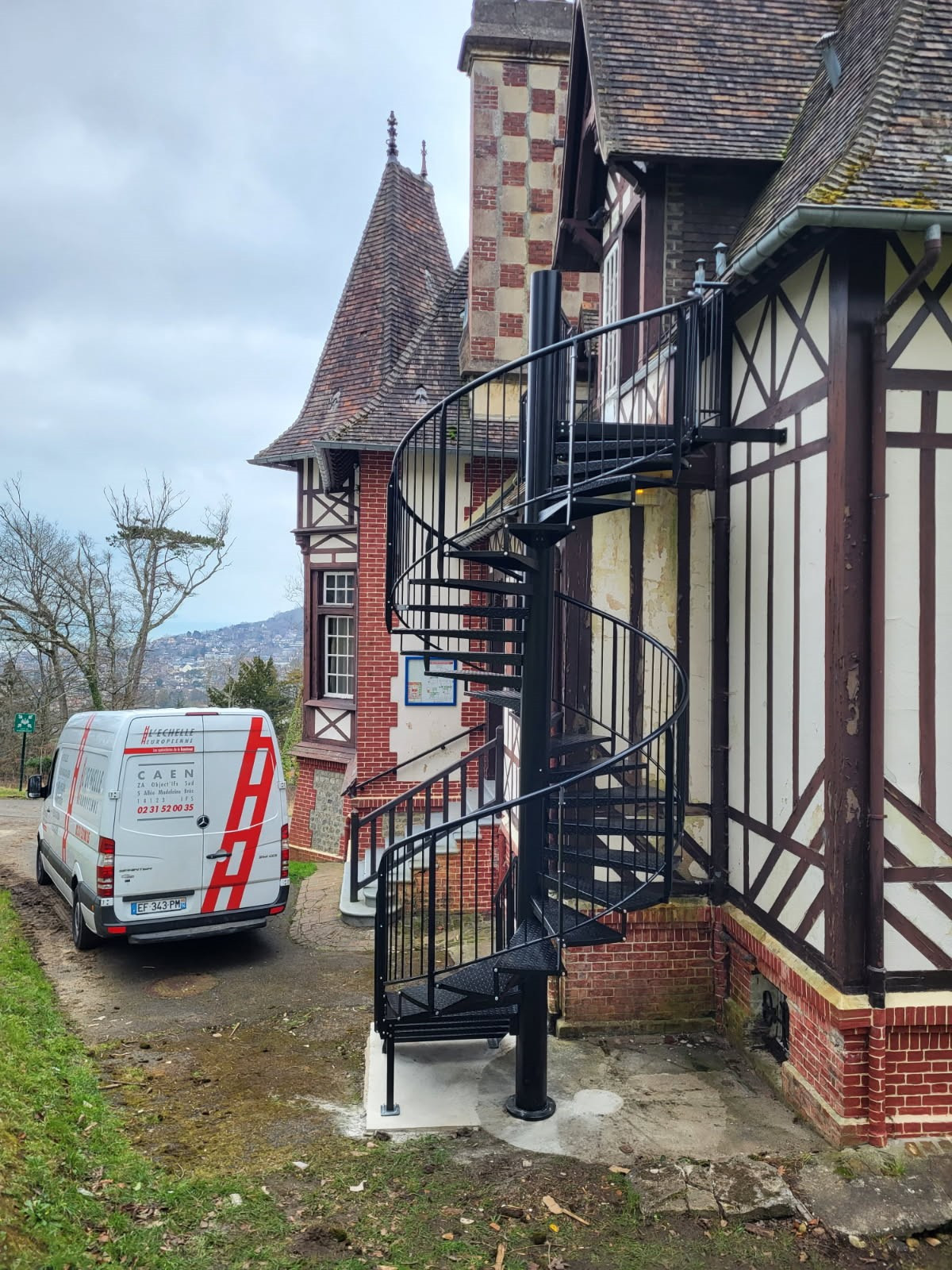 L'Echelle Européenne Caen a réalisé la fourniture et la pose d'un escalier hélicoïdal de secours sur une bâtisse traditionnelle de Houlgate. Conçu en structure métallique avec marches antiglisse et garde-corps, cet escalier assure un évacuation rapide et en toute sécurité.