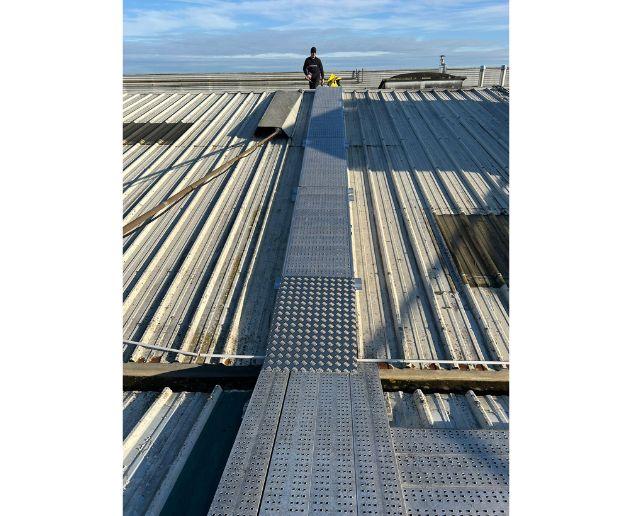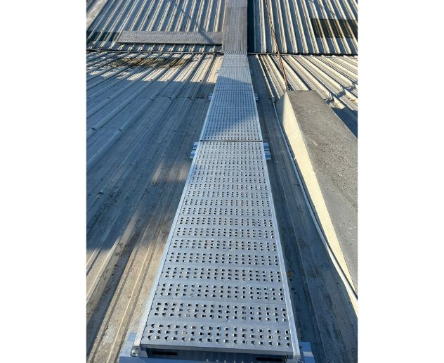 La passerelle a été posée directement sur une toiture en bac acier, grâce à un système de fixation adapté qui respecte l’intégrité de la couverture tout en assurant une excellente stabilité. Sa surface antidérapante garantit une adhérence optimale, quelles que soient les conditions climatiques.