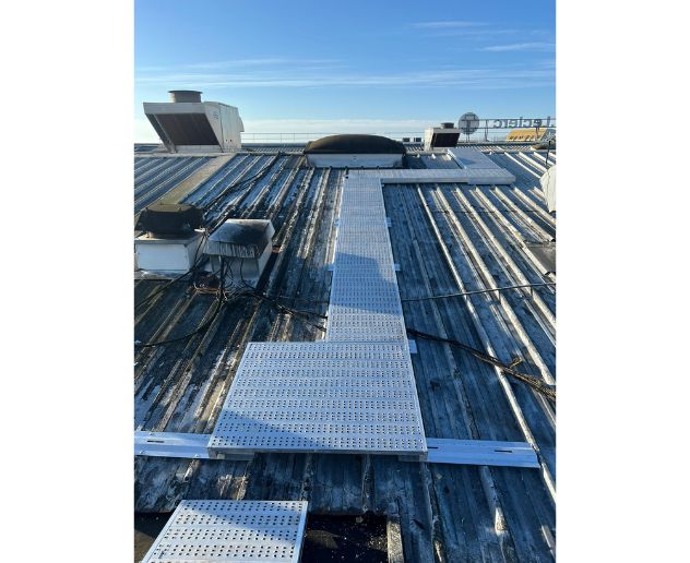 La solution installée appartient à la gamme Fastwalk, une passerelle de toiture conçue pour sécuriser les déplacements des intervenants lors des opérations de maintenance, d’inspection ou d’entretien.