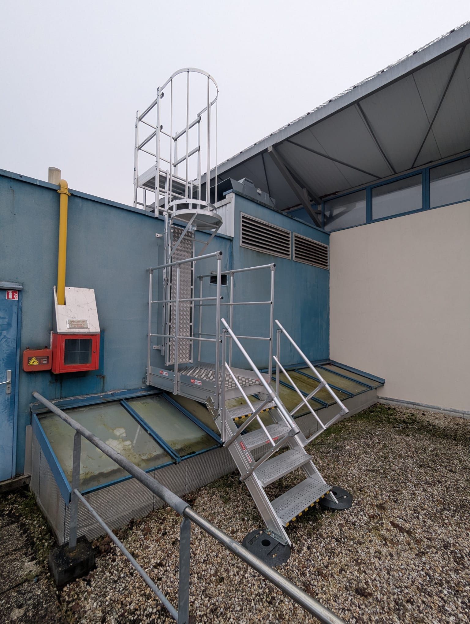 L’installation comprend une échelle à crinoline en aluminium Fixup, spécialement conçue pour l’accès permanent aux toitures techniques.