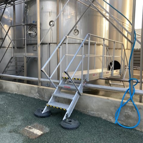 Cette structure en aluminium permet aux techniciens de franchir en toute sécurité un obstacle constitué de tuyauteries et d'un muret, présent dans l'environnement industriel de la laiterie. Légère et robuste, elle est équipée de marches antiglisse, de garde-corps et d'une main courante pour garantir un passage sécurisé.