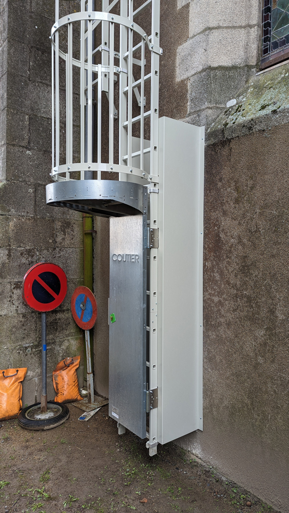 L'Echelle Européenne 85 a effectué la mise en place de 2 échelles à crinoline double de 9,60 m, thermolaquée, installée sur l'église de La Gaubretière (85). L'Échelle a été totalement verrouillée à l'accès avec une porte de condamnation renforcée, des joues de protection et des filants supplémentaires en partie basse.