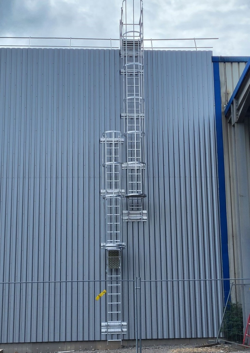 Nouvelle pose d'une échelle à crinoline en aluminium a double volée sur le bardage d'un bâtiment industriel avec une sortie passerelle pour passage d'acrotère et une demi-porte de condamnation et opercule.