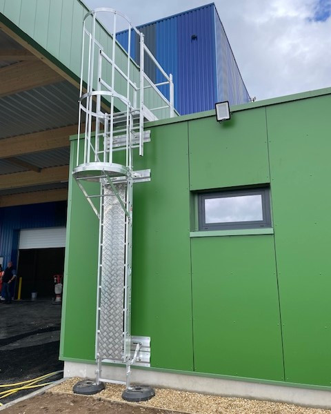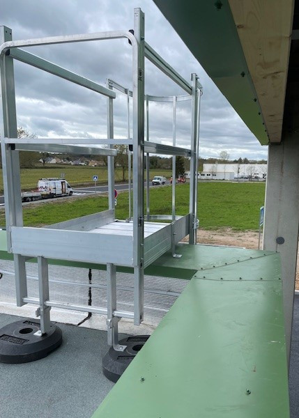 Le magasin de L'Echelle Européenne Le Mans a fabriqué et posé une échelle à crinoline aluminium avec une sortie passerelle pour le franchissement d'acrotère.