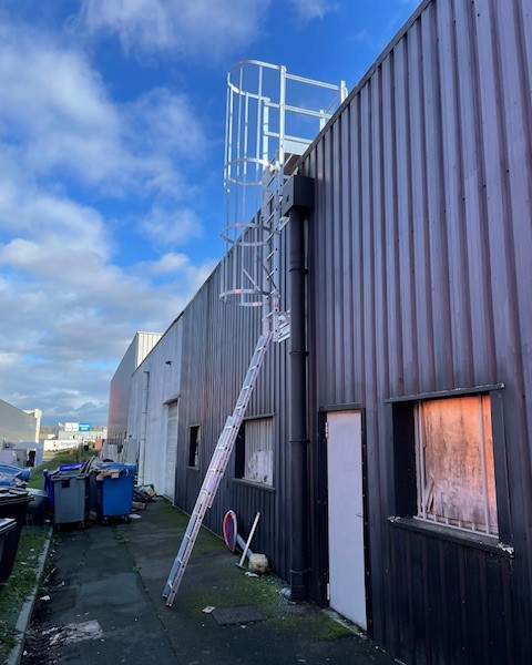 L’équipe du Mans à réalisé la pose d’une échelle à crinoline en aluminium, avec un accès par une échelle coulissante et un passage d’acrotère avec sortie sur une passerelle. L’ensemble à été posé sur du bardage.