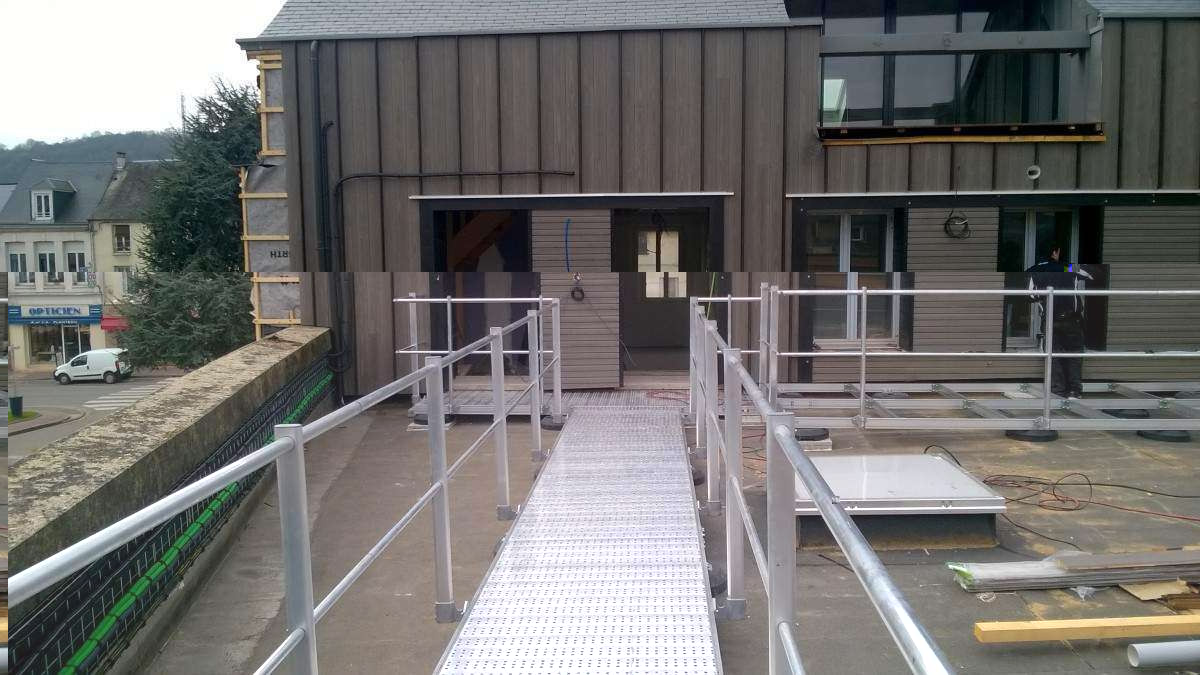 Mise en place d’une passerelle de cheminement autoportante installée sur une toiture terrasse et également de la fourniture d’un cadre en fabrication spéciale
