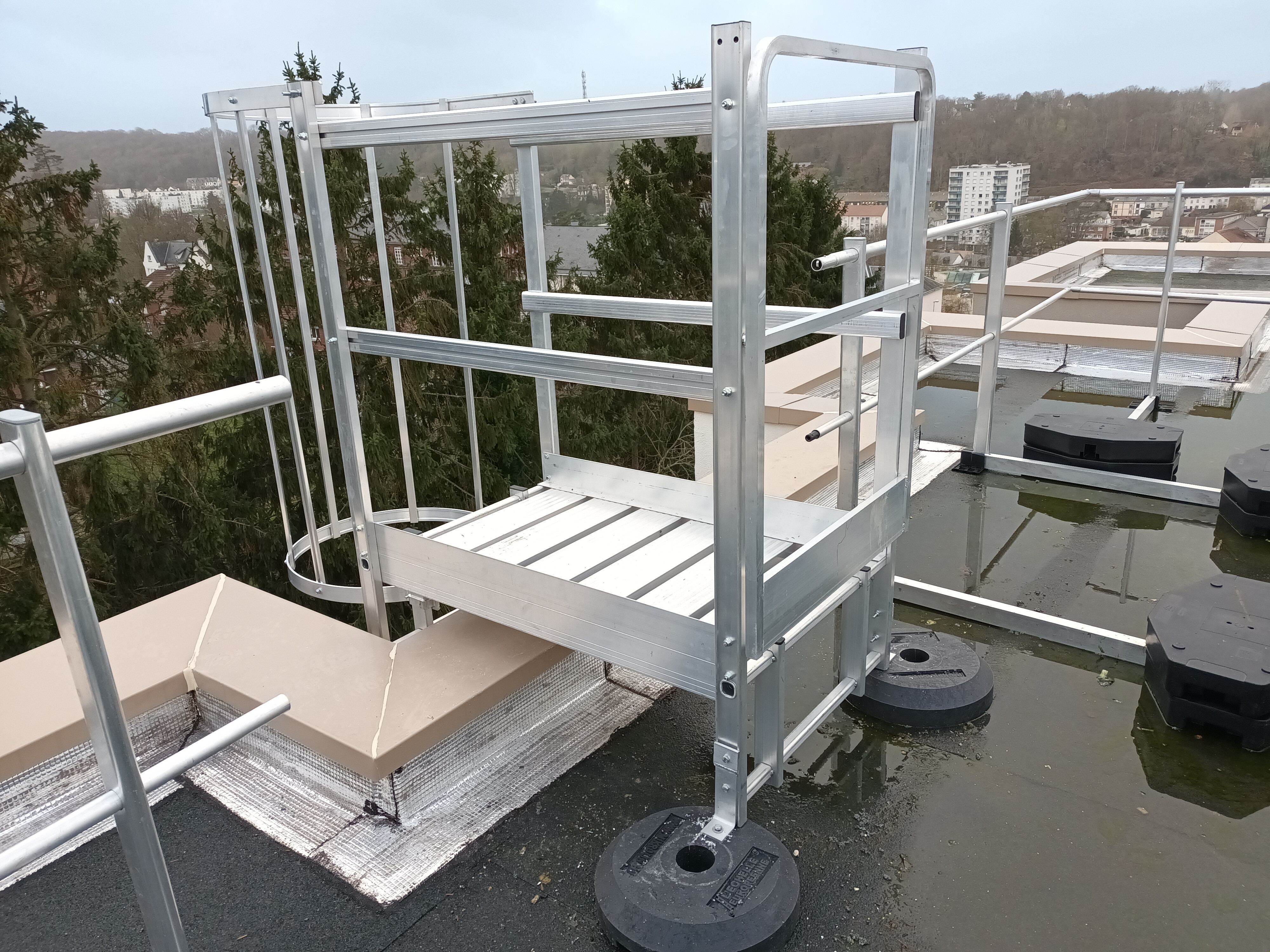 Echelles à crinoline avec passage d’acrotère plots résine et raccords sur garde-corps en aluminium,