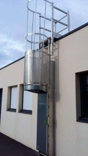 magasin L'Echelle Européenne de Caen a réalisé la pose de cette échelle à crinoline en aluminium avec porte de condamnation pour le collège de Villers-Bocage dans le département du Calvados (14).
